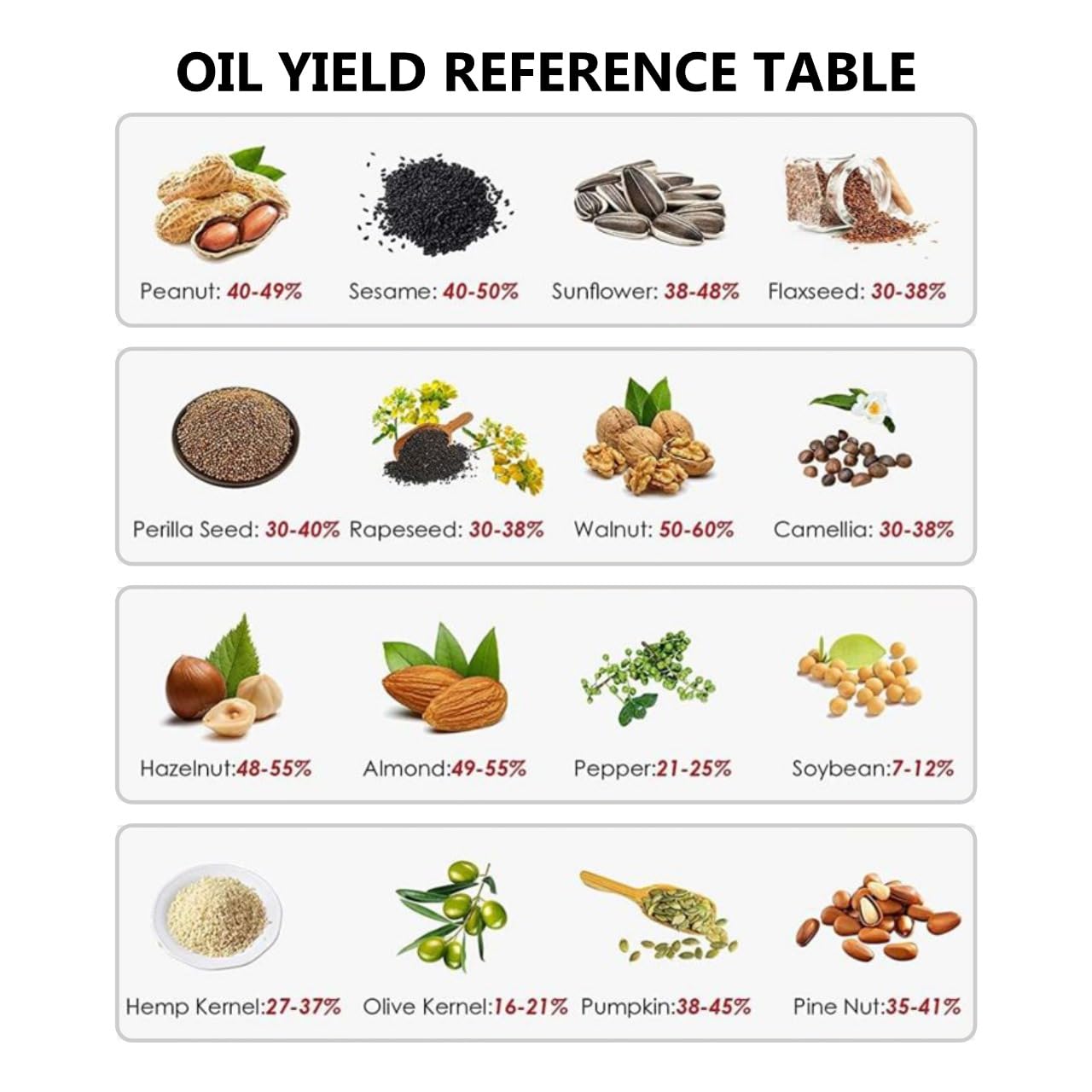 Wide Compatibility From sesame seeds to almonds and everything in between, our Oil Maker Machine accommodates a wide range of seeds and nuts, ensuring you can create an array of oils to suit your culinary preferences. Versatility at cold press oil machine