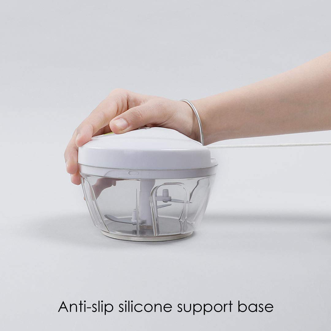 The chopper has anti-slip silicon support at the base of the bowl so that it does not move around when placed anywhere. When placed on the top of the table, it will not budge even when you apply rigorous pulling motions.