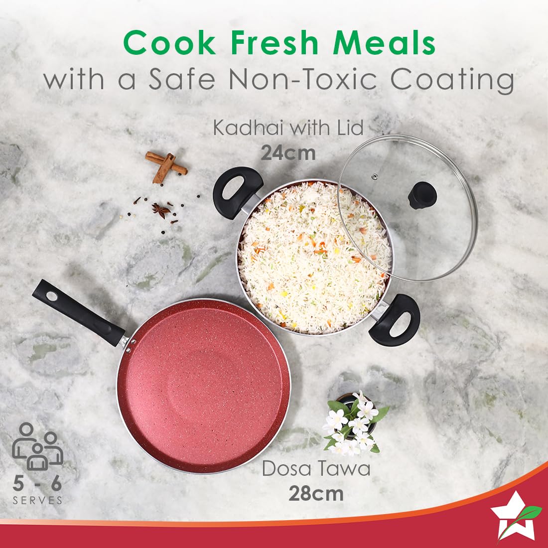 Enjoy the wonderful cooking experience with Galaxy Cookware Set by Wonderchef. The striking red & black colour will surely add beauty to your kitchen. This set comprises a Kadhai with lid 24 cm and a Dosa Tawa 28 cm and is made from pure grade virgin aluminum which enables even heat distribution and faster cooking. Its premium healthy non-stick coating allows oil free cooking without any compromise on taste! Get superior performance every time you cook with the Galaxy cookware set.