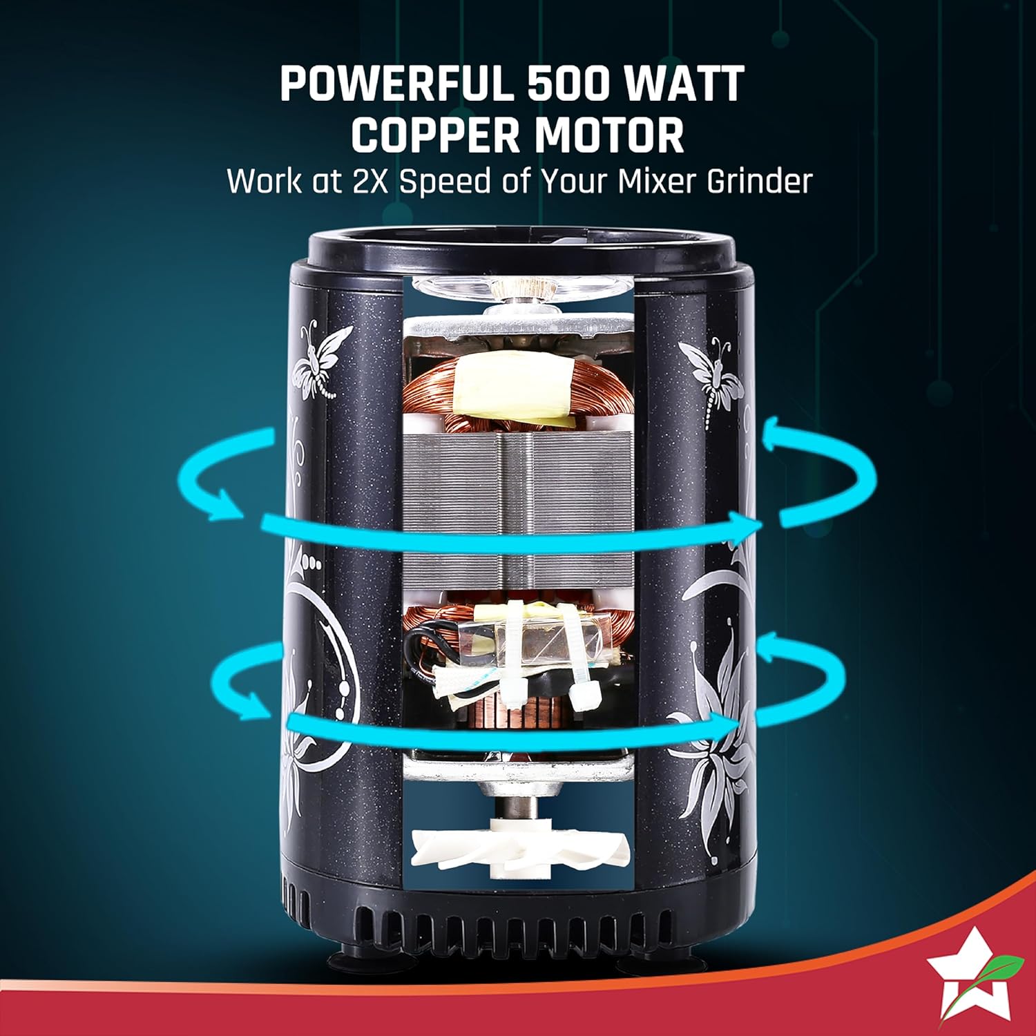 POWERFUL 500W 100% FULL COPPER MOTOR: The best-in-class and powerful 500 Watt motor generates 22,000 RPM – twice that of normal mixer grinders. 100% Copper motor grinds the toughest chutneys and masalas with ease.