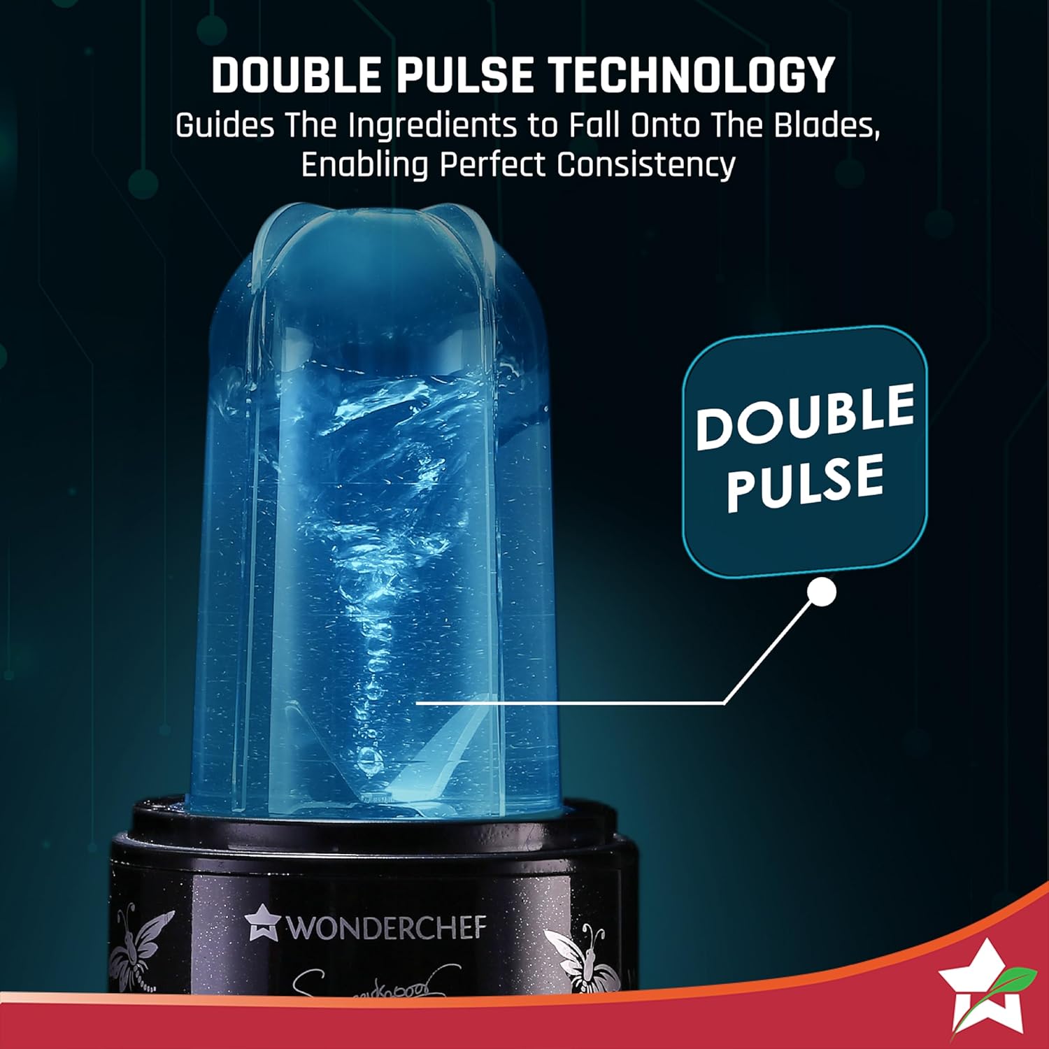 DOUBLE PULSE TECHNOLOGY: Once the mixer starts, it stops twice for 2 seconds after every 4 seconds. This feature of very sophisticated blenders allows the contents to settle down and fall back on the blades for perfect blending rather than sticking on the sides.