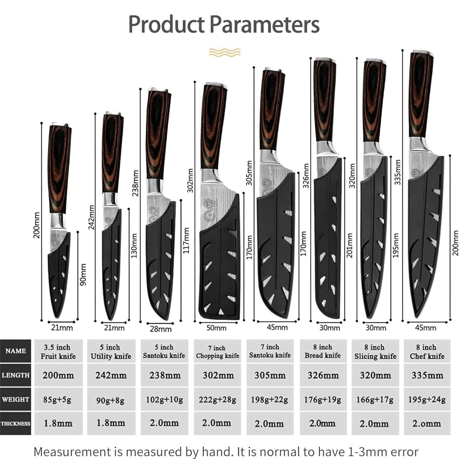 ▶【Package Includes】 XYj cutlery set includes: 1 x 3.5 inch paring knife, 1 x 5 inch utility knife, 1 x 5 inch Santoku knife, 1 x 7 inch Santoku knife, 1 x 7 inch Nakiri, 1 x 8 inch slicing knife, 1 x 8 inch bread knife, 1 x 8 inch chef knife, 8 x knife sheaths, 1 x 8 pockets roll bag, 1 x mini whetstone