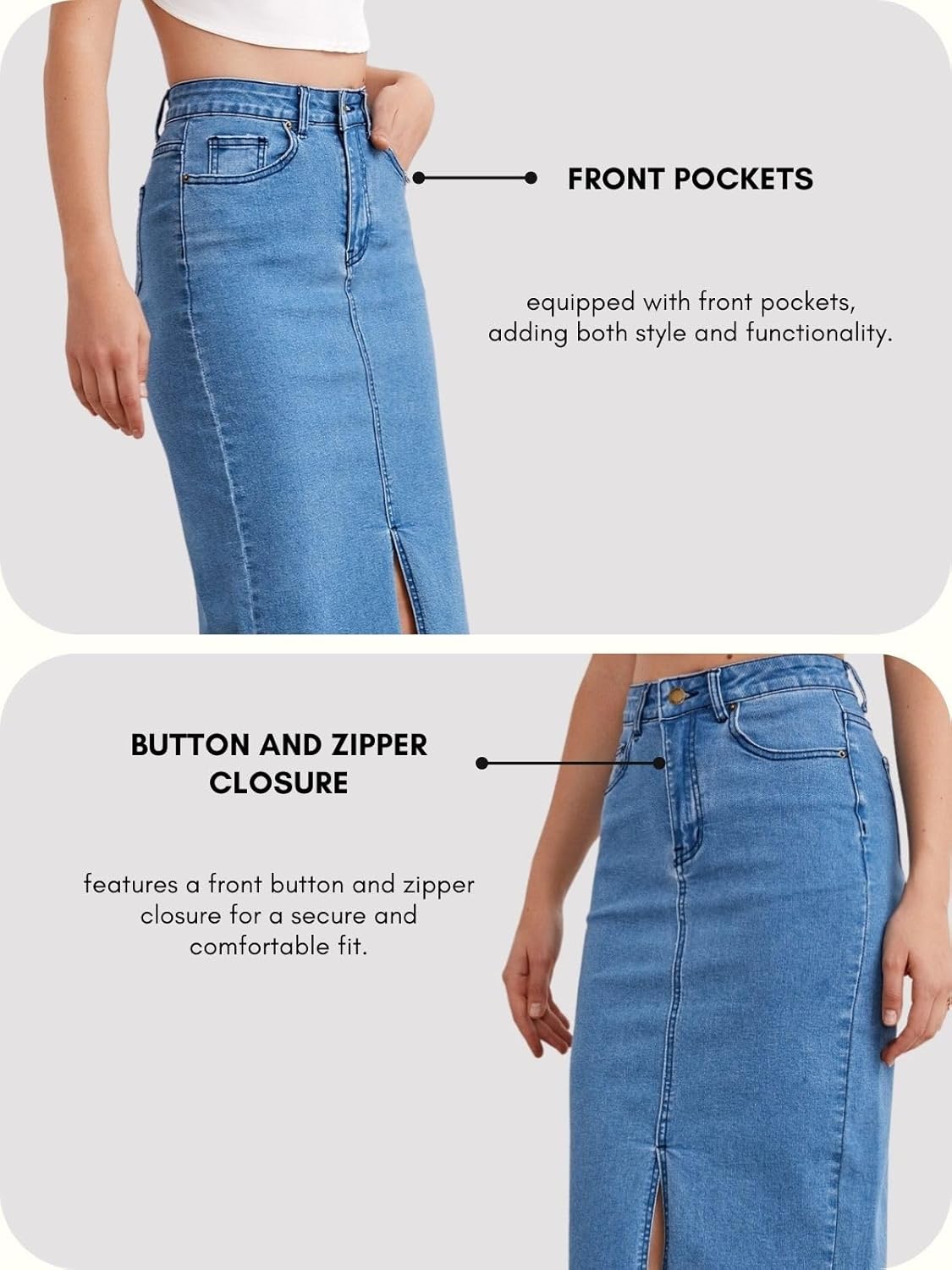 Introducing our quality denim skirt, meticulously crafted from high-quality denim fabric, ensuring comfort and durability for everyday wear while maintaining its chic appeal. Effortlessly elevate your fashion game with this long denim skirt for women, seamlessly pairing with blouses, sweaters, or tees for a chic and put-together look, making it a versatile addition to your wardrobe. Capturing an ageless aesthetic, this long denim pencil skirt is suitable for both women and girls, serving as a timeless wardrobe essential that transcends generations, ensuring enduring style and versatility. Embrace the classic denim aesthetic with this skirt, exuding a timeless vibe that provides a versatile canvas for expressing your personal style through various tops, shoes, and accessories, ensuring endless outfit possibilities.