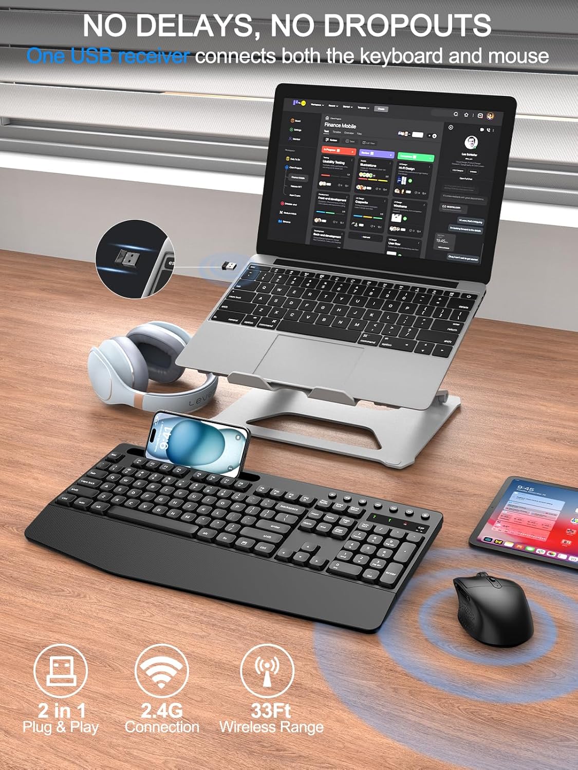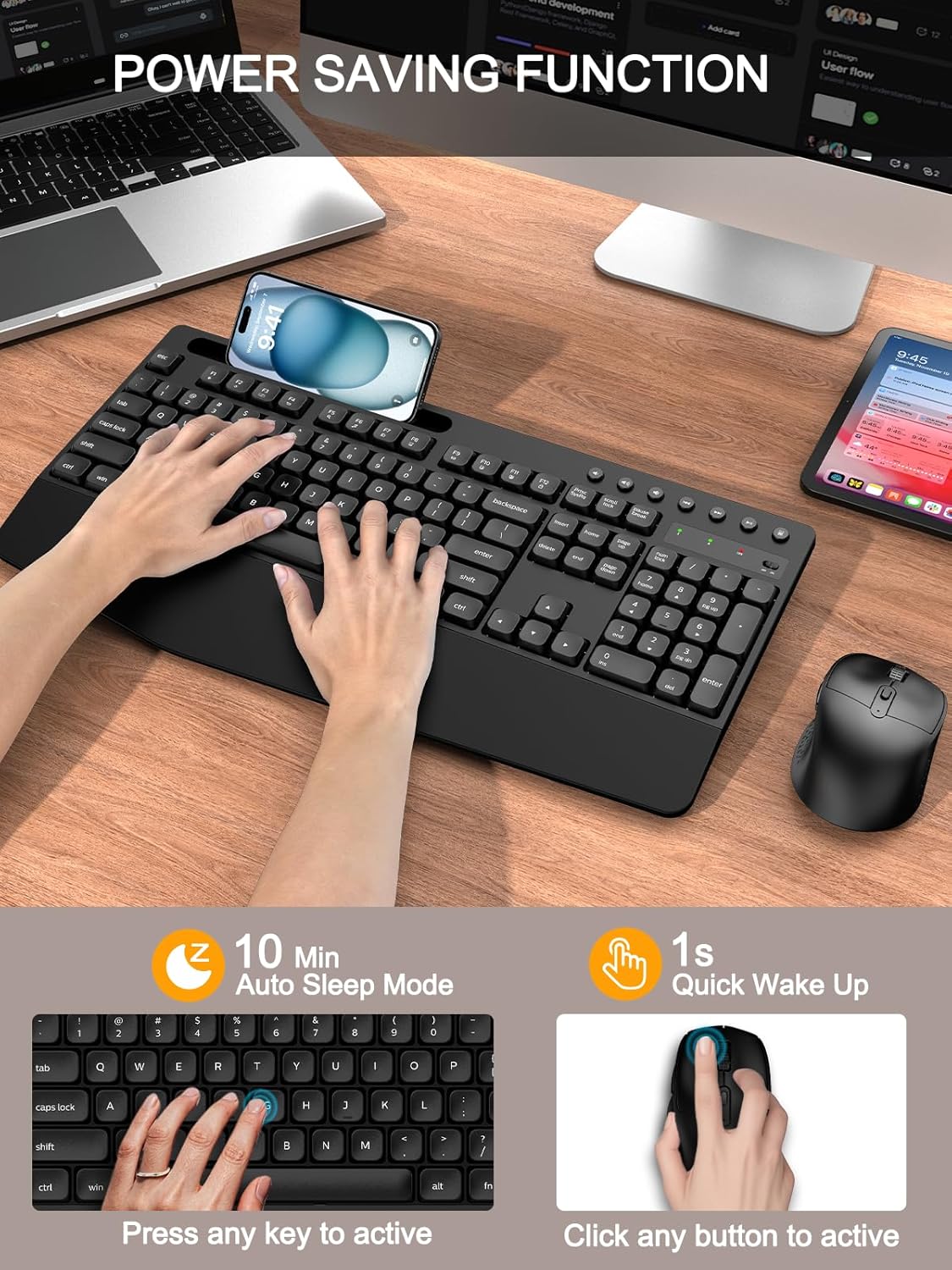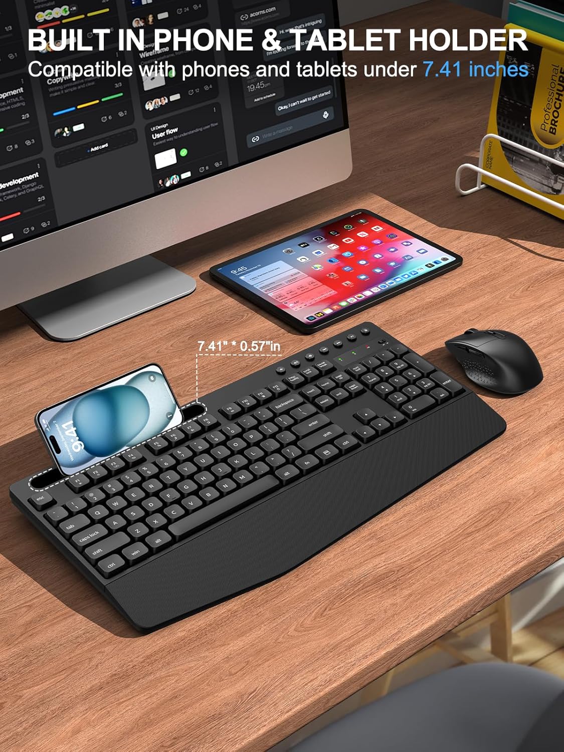 【Phone & Tablet Holder】This full-size keyboard includes a built-in holder for phones and tablets up to 11.9 inches, perfect for multitasking and ensuring you never miss anything important.