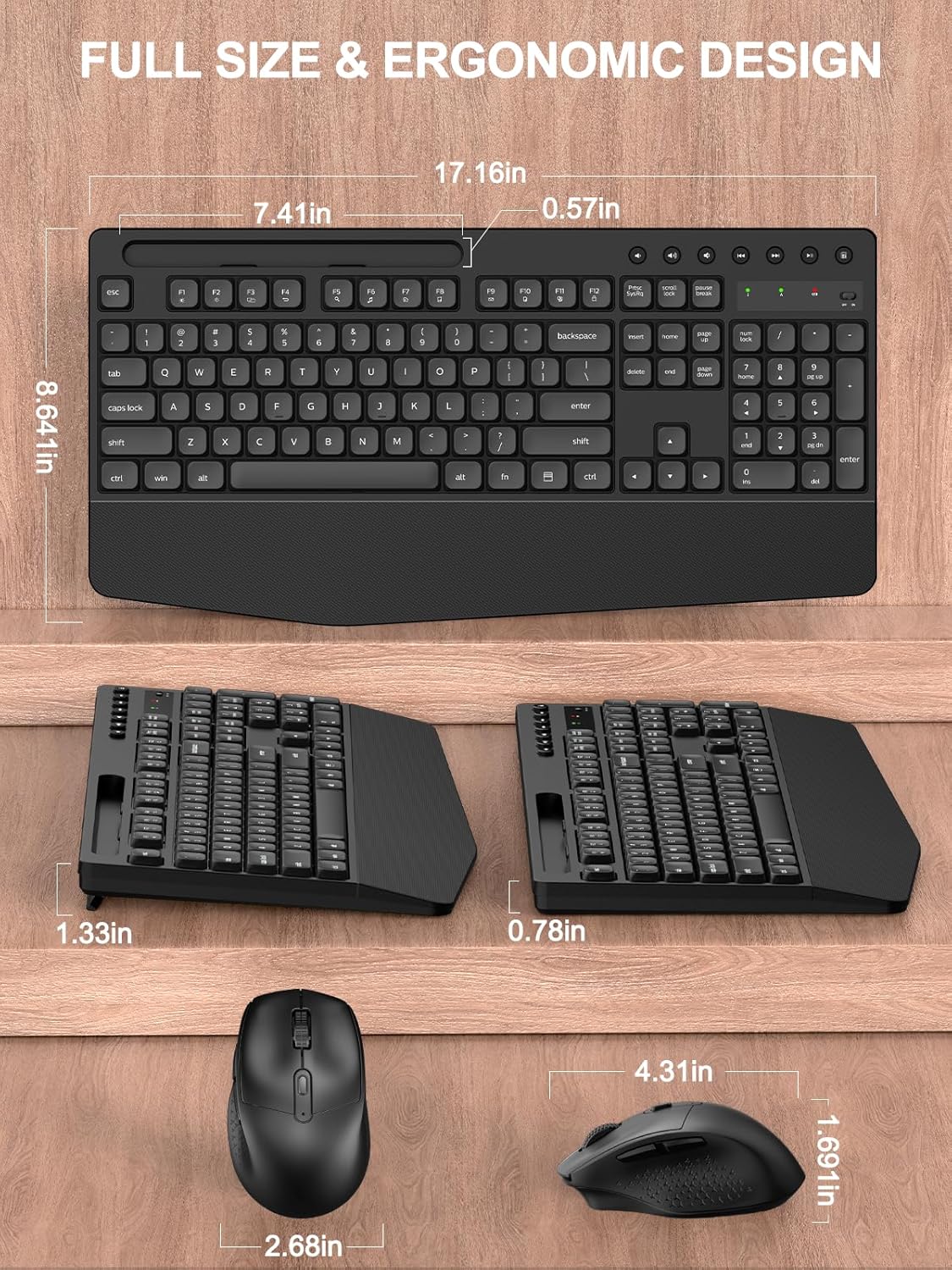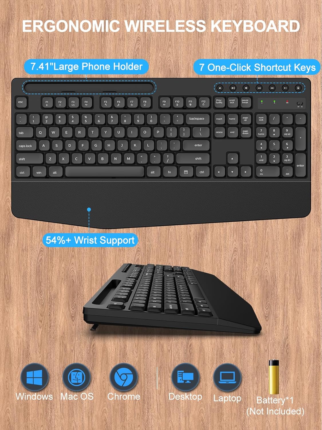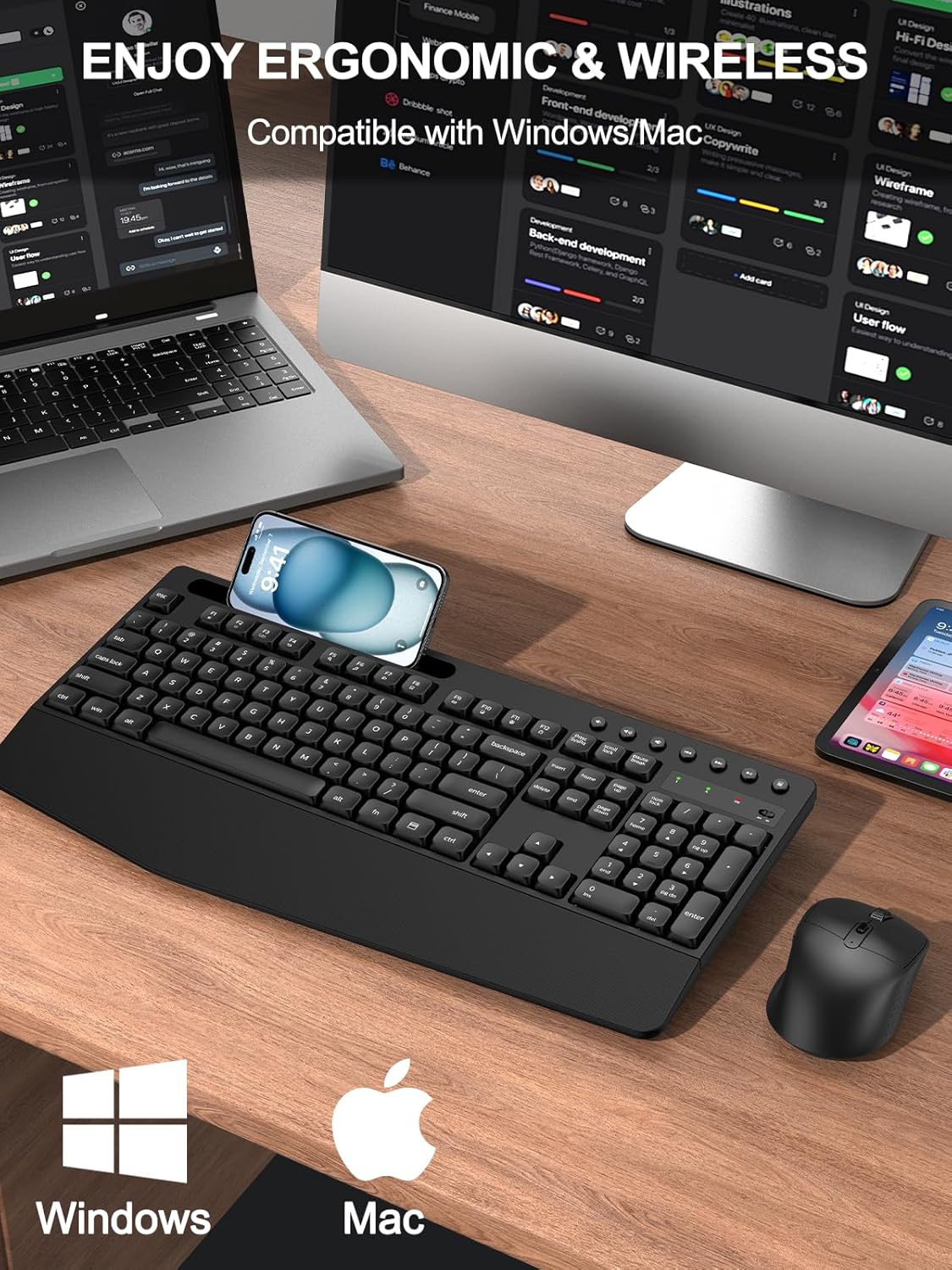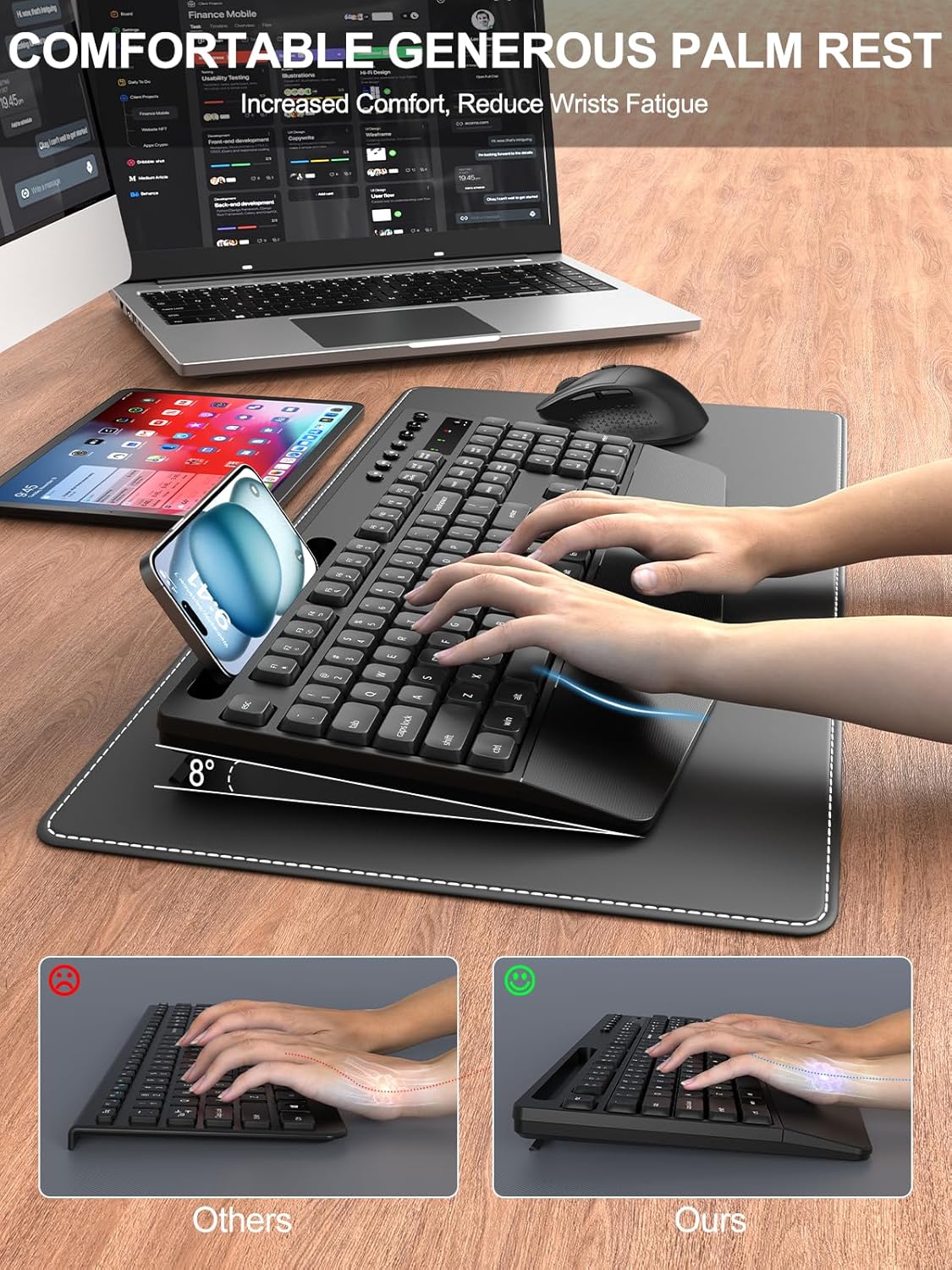 【Ergo Wrist Rest】Experience the 2024 upgraded ergonomic wireless keyboard! Featuring a 2.8-inch wide wrist rest for enhanced hand support and a 10° tilt angle to prevent wrist strain, ensuring every typing session is more comfortable and enjoyable while you work.