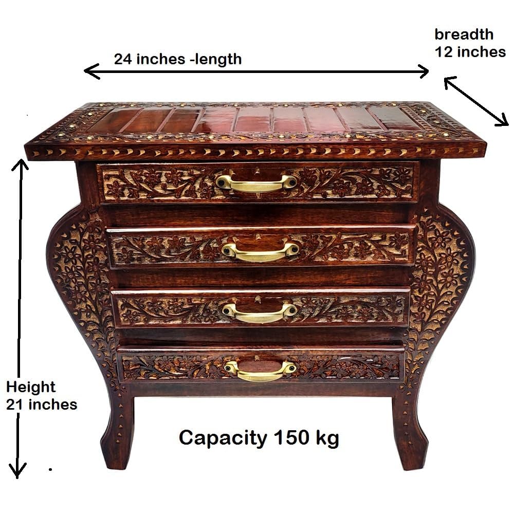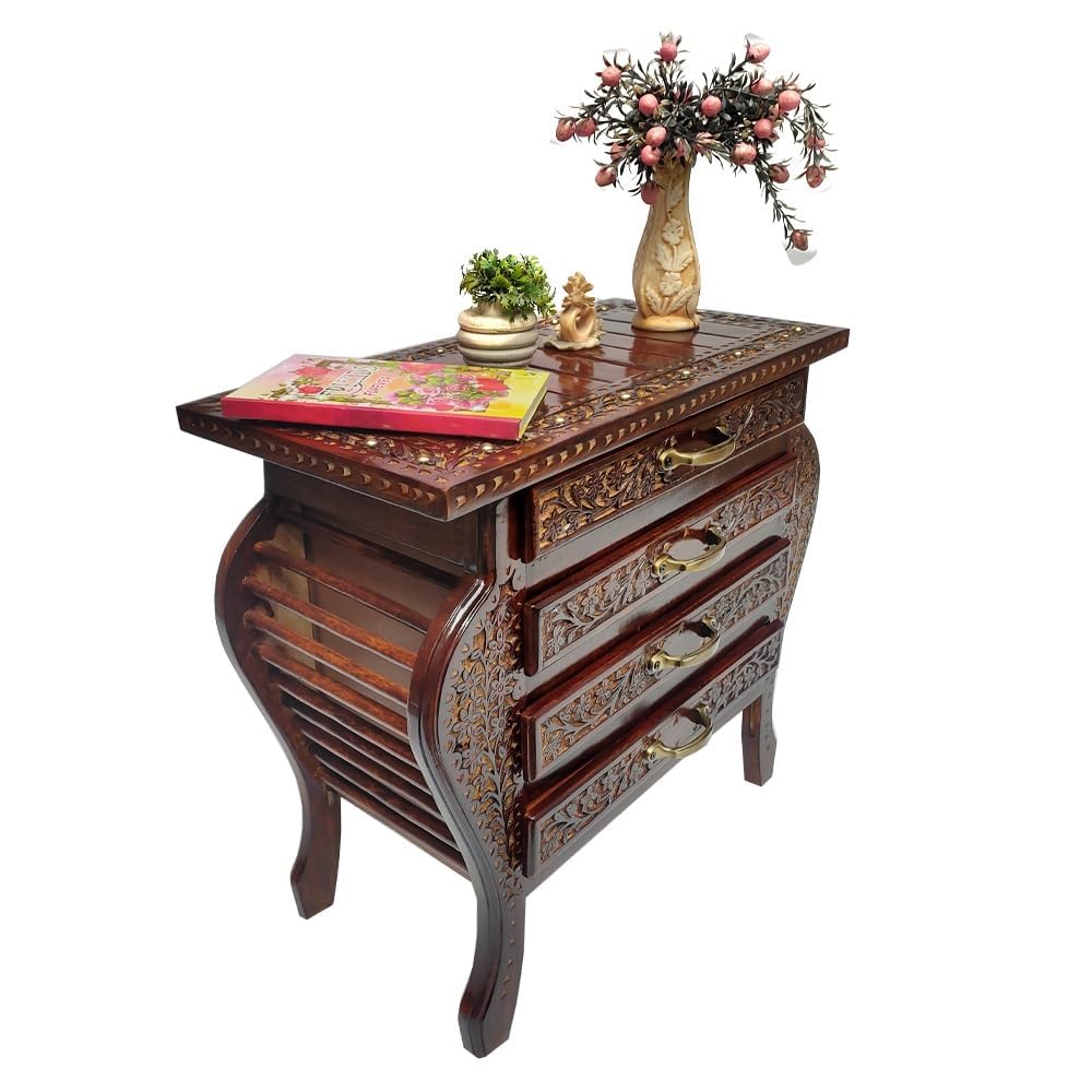 With its numerous uses, this wooden side table is ideal for the living room and bedroom. It can be used as a coffee table, a place to put a flower pot, a place to put a lamp, and much more.with four drawers.This wooden table is carved by hand to give it an antique appearance, which will enhance the design of your home.This multifunctional table can be used as an end table, bedside table, coffee table, nesting table, and more. Handcrafted and floral carved with pearls, each item is the cherry on top. It’s Ideal For The House Or The Office. You can use this vintage, handcrafted painting table for home décor or as a gift. It’s ideal for use as a bedside table or coffee table. Sculpted by Saharanpur’s SHAMA EXPORT ENTERPRISES, the biggest hub for wooden handicrafts in India.Details * Material: Mango Solid Wood