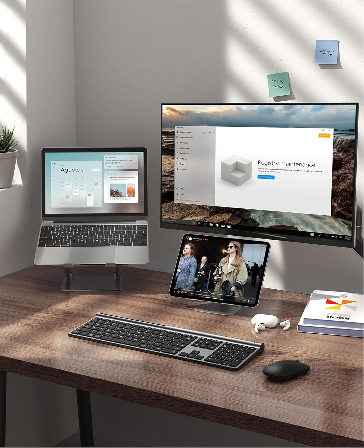 [With to 3 Devices]: The bluetooth keyboard and mouse combo enabled to support up to 3 devices simultaneously. Just press 2.4G/Bluetooth 1/Bluetooth 2 button to fast switch back and forth between the input device. Multi-Device Keyboard and mouse for Mac, iPad, Apple, Android, Windows. Compatible with Mac OS/iOS 10.12 or above, Windows 8/10 or above, Android 4.3 or above.(Card slot can‘t be placed tablet, only phone)