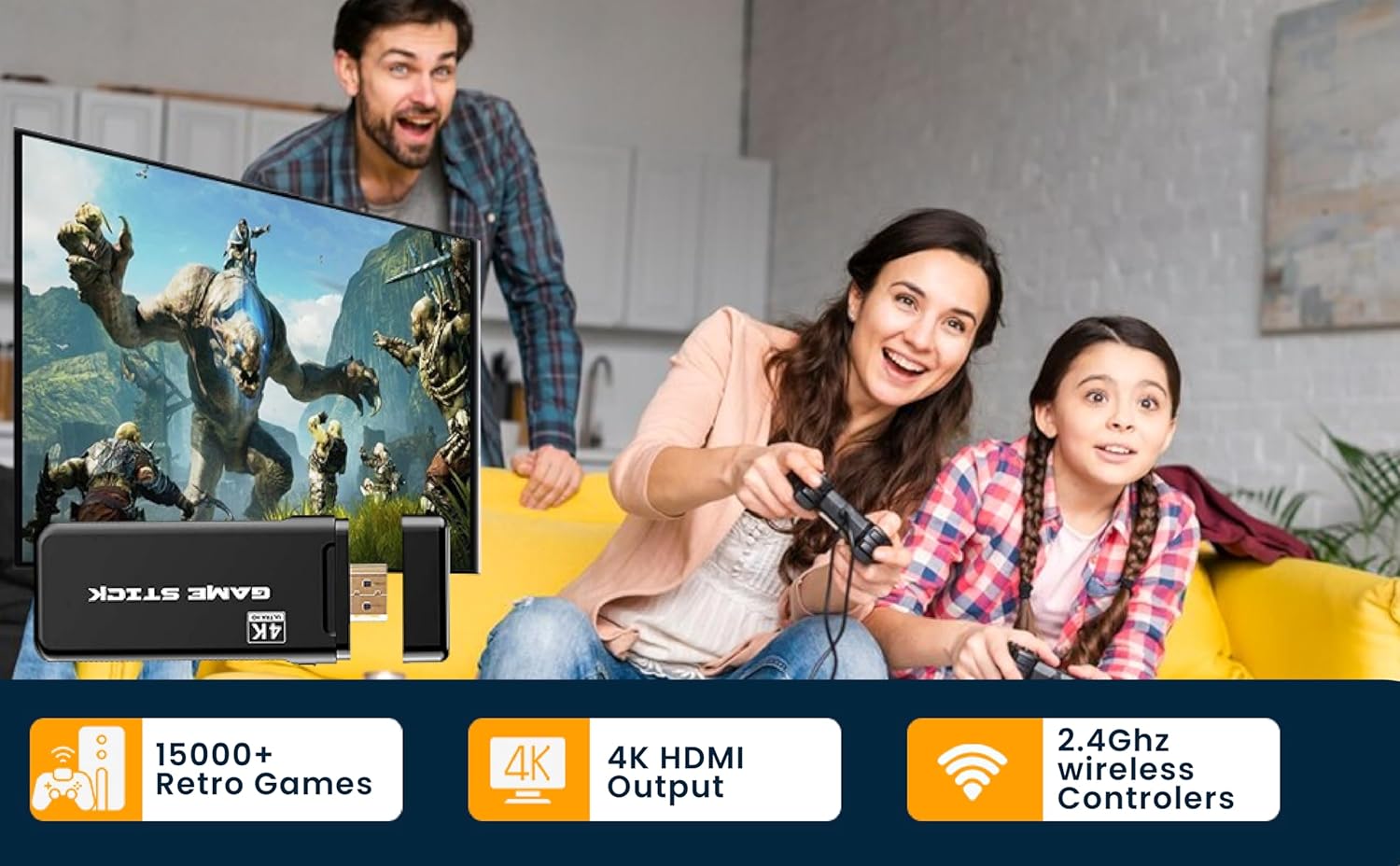 “Experience a nostalgic journey with over 20,000 retro classic games already loaded on this console. Relive your cherished youth memories with just one device. The console comes with a built-in classic retro game console and a 64GB SD card, so there’s no need to download games or rely on Wi-Fi. Simply connect the gamepad to the power supply, plug it into your TV, and select the HD channel to access the game list screen, giving you the freedom to move and game comfortably. It’s as simple as 1-2-3: connect the HD output to your TV, insert the built-in TF game content card, and use the charging adapter to connect to the power supply.”