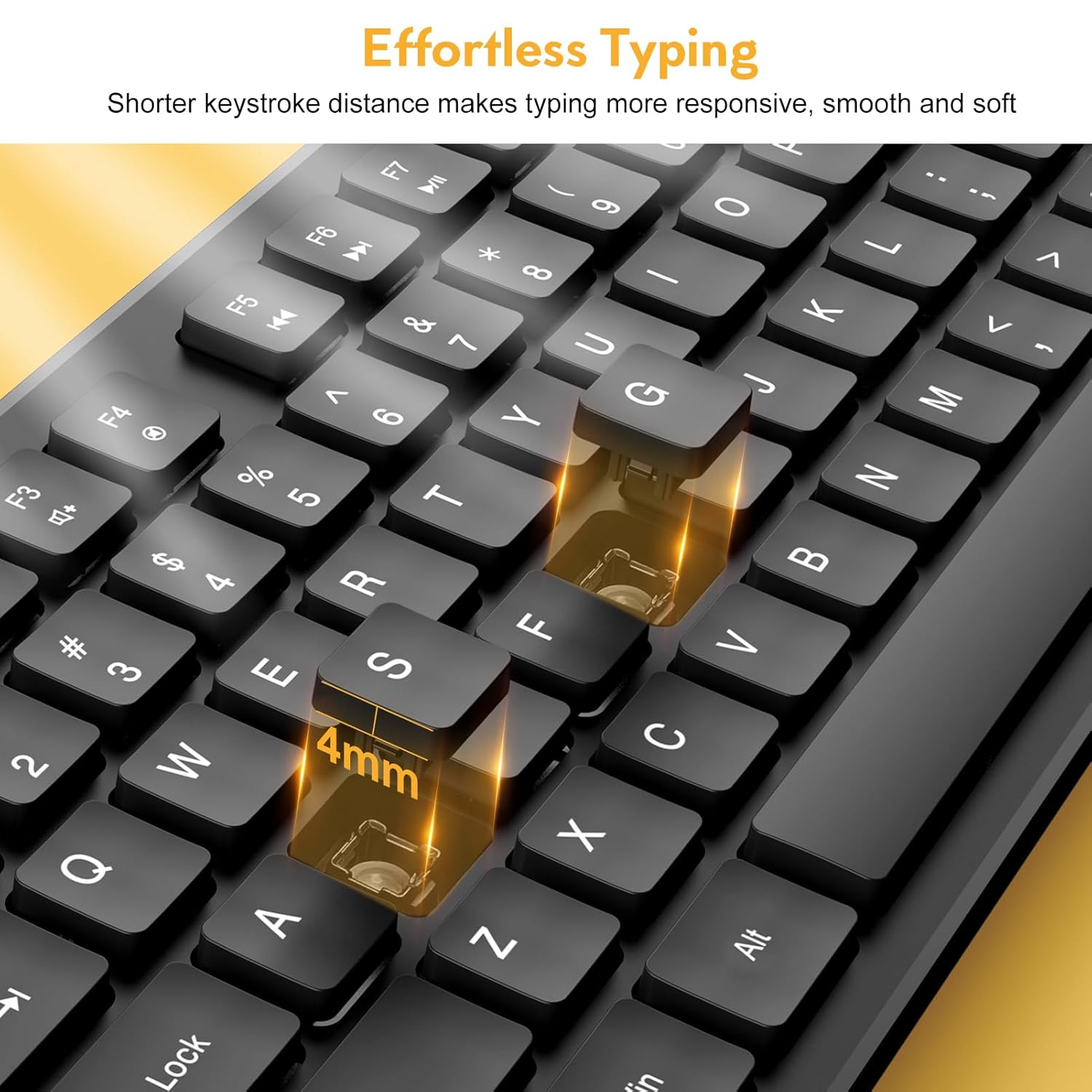 COMFORTABLE & SMOOTH TYPING: The ergonomic tilt angle offers a better typing position to reduce the pressure on your wrist and increase comfort. Shorter keystroke distance and standard 104-key U.S. QWERTY layout make typing more responsive, smooth and soft.
