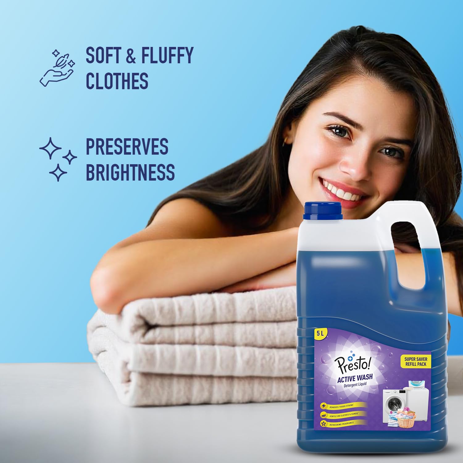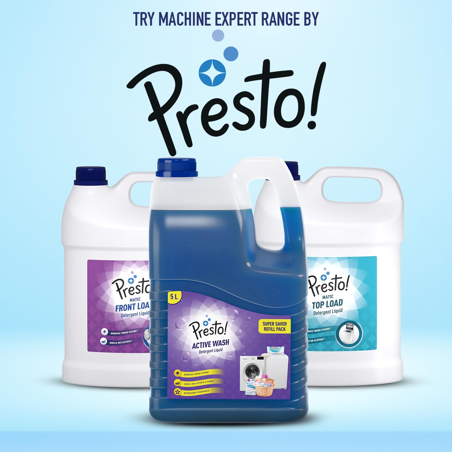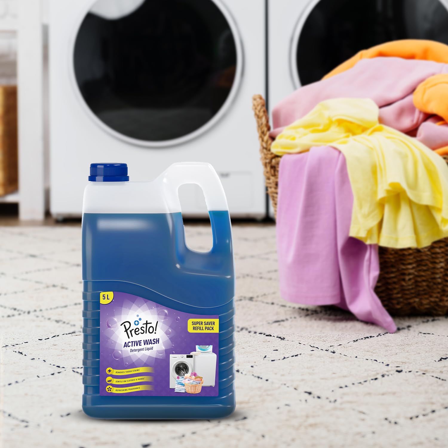 Introducing the Amazon Brand Presto! Active Wash Detergent Liquid, crafted for a deep and effective clean with just a small amount. Its ultra-concentrated formula tackles tough stains, grease, and ground-in dirt effortlessly, making it suitable for both standard and high-efficiency washing machines. Free from dyes, and harsh chemicals, it ensures a gentle touch on your skin and a clean rinse without residue or lingering odors. Ideal for a range of fabrics, including delicates and activewear, this compact and refillable bottle offers great value and is proudly made in India.
