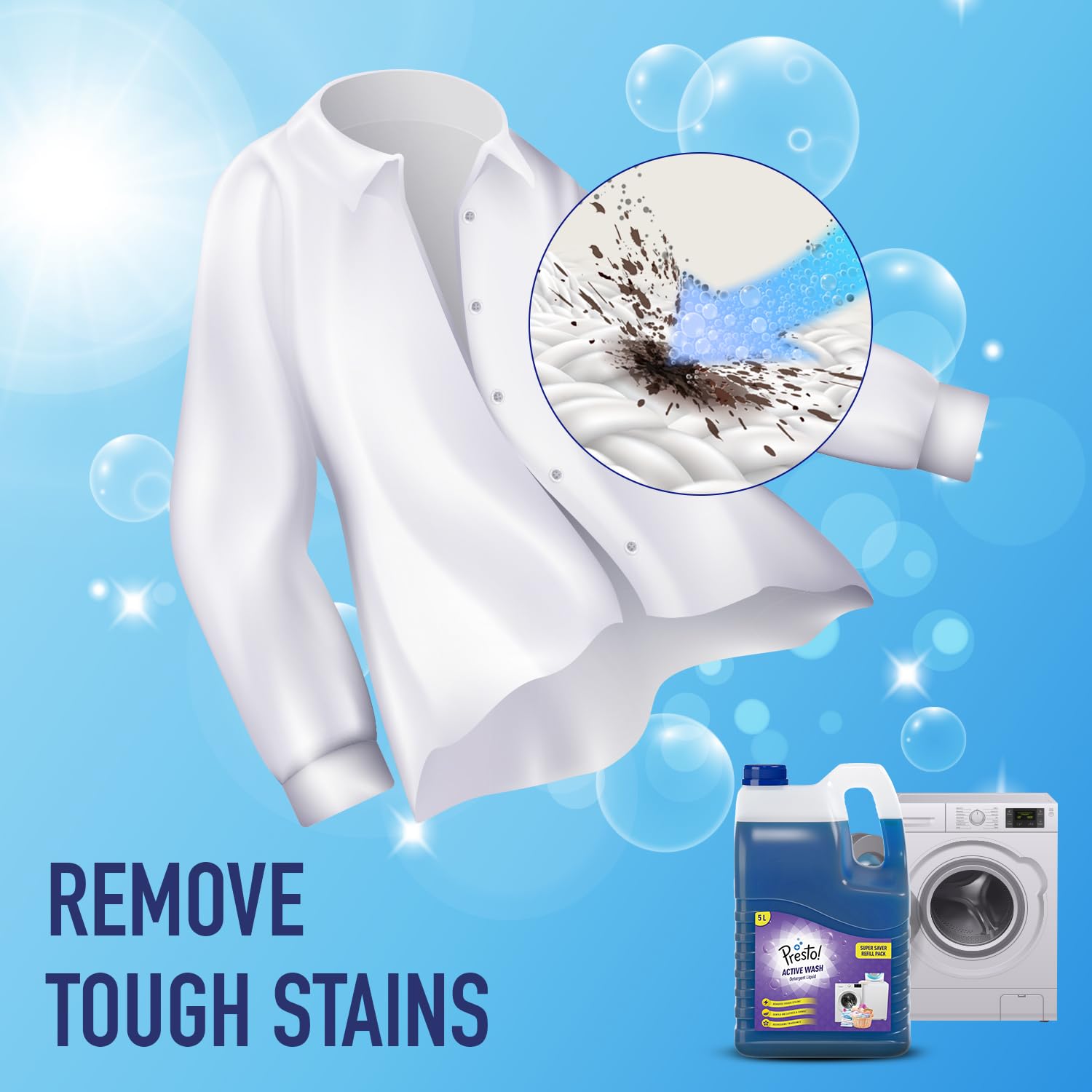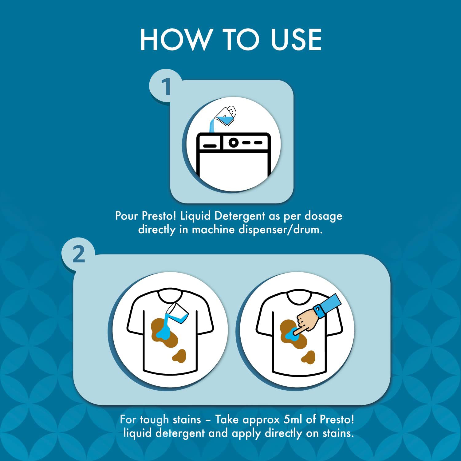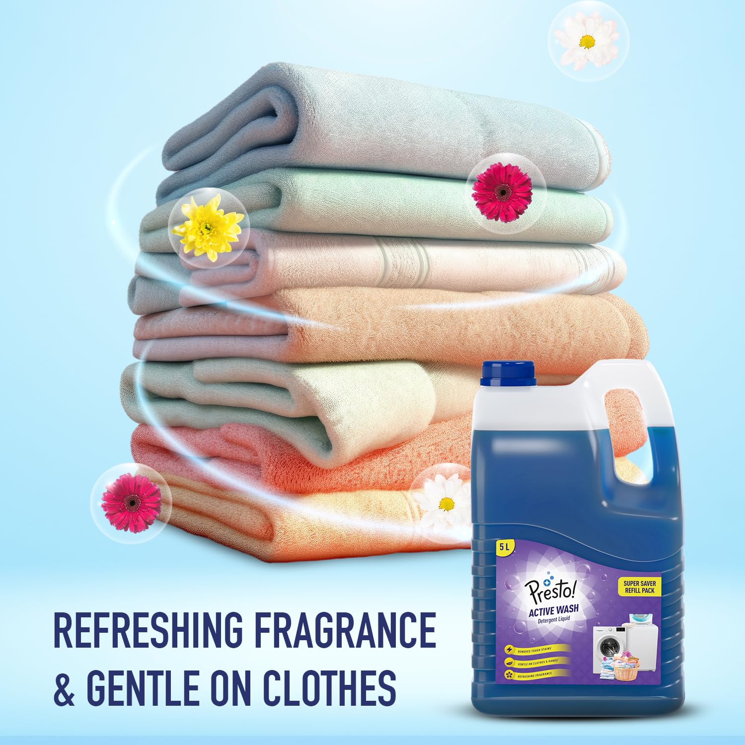 Introducing the Amazon Brand Presto! Active Wash Detergent Liquid, crafted for a deep and effective clean with just a small amount. Its ultra-concentrated formula tackles tough stains, grease, and ground-in dirt effortlessly, making it suitable for both standard and high-efficiency washing machines. Free from dyes, and harsh chemicals, it ensures a gentle touch on your skin and a clean rinse without residue or lingering odors. Ideal for a range of fabrics, including delicates and activewear, this compact and refillable bottle offers great value and is proudly made in India.