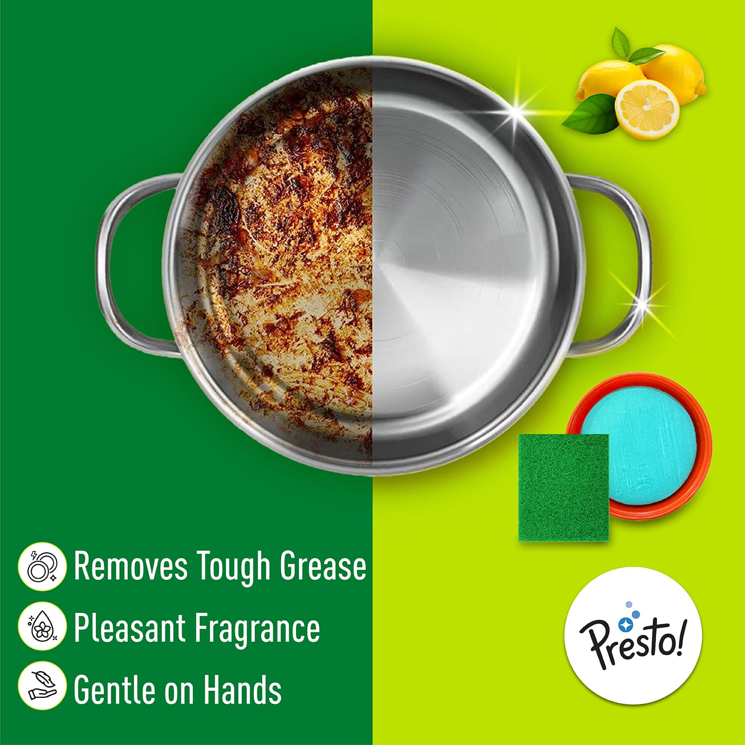 Introducing Amazon Brand – Presto! Dishwash Tub Bar, your reliable solution for sparkling clean utensils. This bar is tough on grease and grime, yet gentle on your hands, ensuring a fresh, odor-free finish. Perfect for various utensil types, it effectively removes tough stains with minimal effort, leaving behind a refreshing lemon fragrance. Keep your kitchenware hygienic and your family safe with Presto!