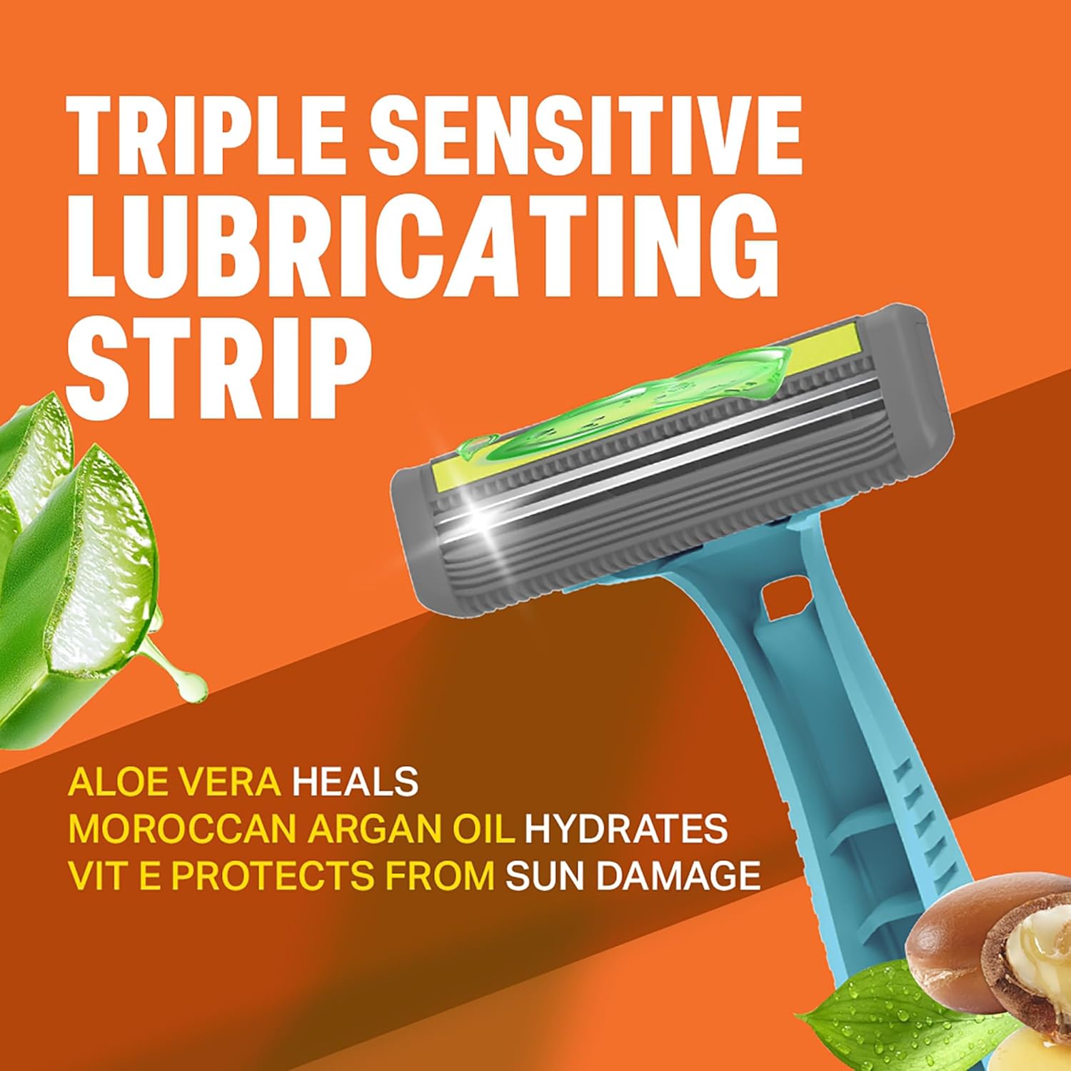 A LUBRICATING STRIP, infused with the goodness of Aloe vera that adds hydration, Moroccan Argan Oil that heals the skin and Vitamin E that nourishes it, to give you smooth shaves and easy glides