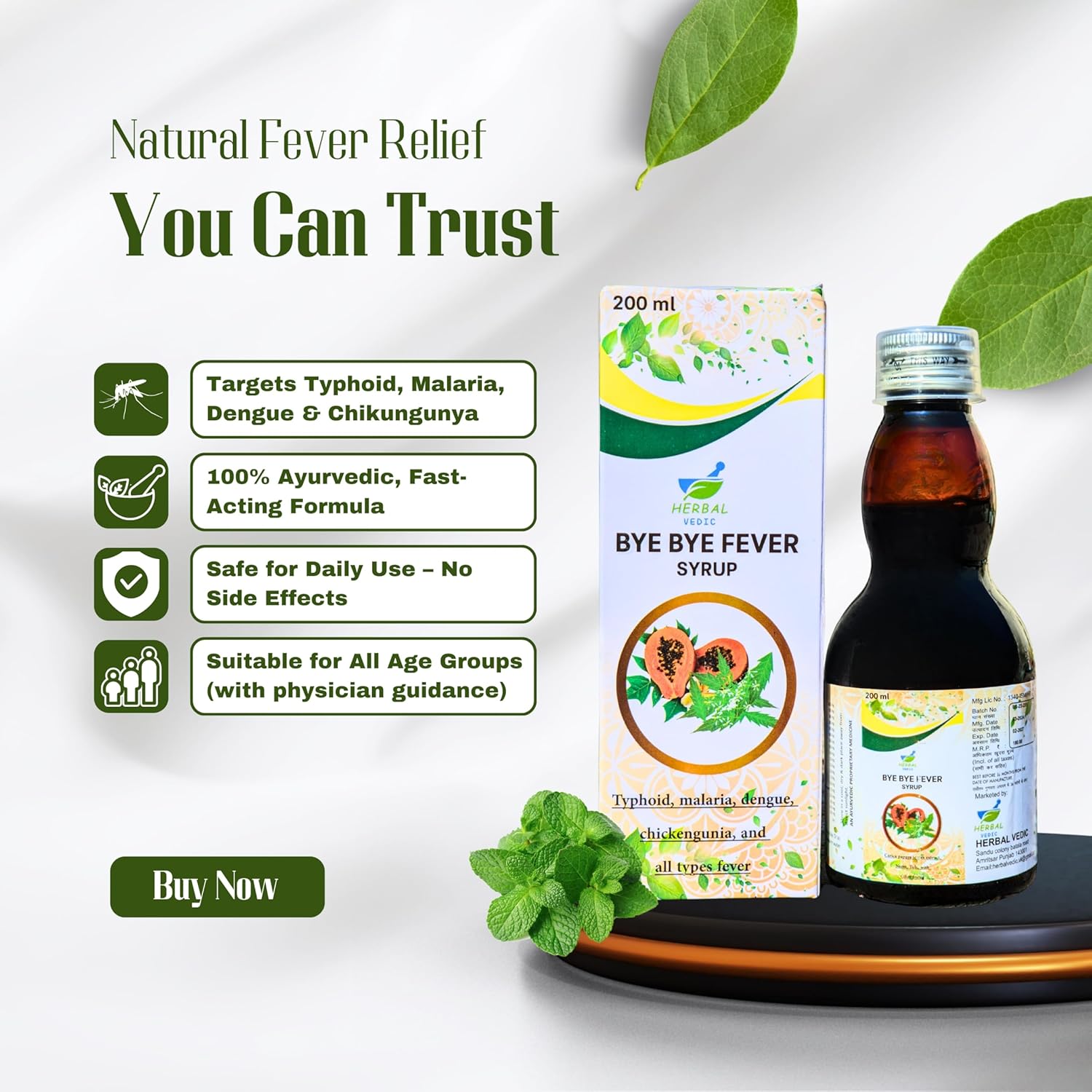 HERBAL VEDIC Bye Bye Fever Syrup | Get Ayurvedic Relief from Throat Issue, Natural Fever Care Syrup | Typhoid, Malaria, Dengue, Chinkengunia | Fever Syrup for kids all types Fever Syrup (200ml)