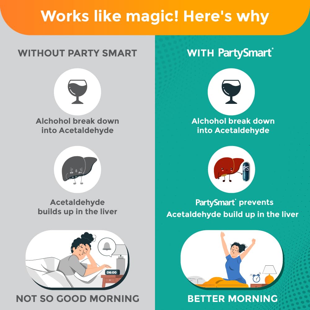 How does Himalaya PartySmart work: When you consume alcohol, it is broken down into acetaldehyde. Acetaldehyde is primarily responsible for hangovers. The build-up of acetaldehyde in the liver leads to a hangover or not so good morning. Himalaya PartySmart helps prevent hangovers by preventing acetaldehyde build up in the liver leading to a better morning.