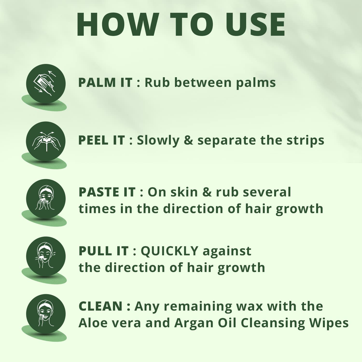 5.HOW TO USE: Rub the strips between palms and gently separate them. Paste on skin, rubbing in direction of hair growth, then quickly pull against the direction of hair growth. Finish with argon oil cleaning wipes