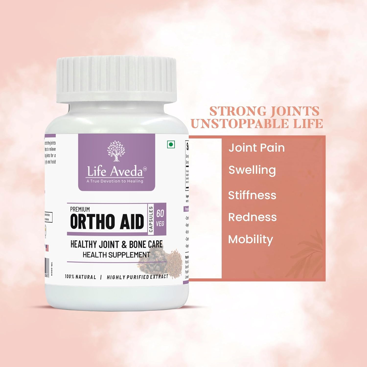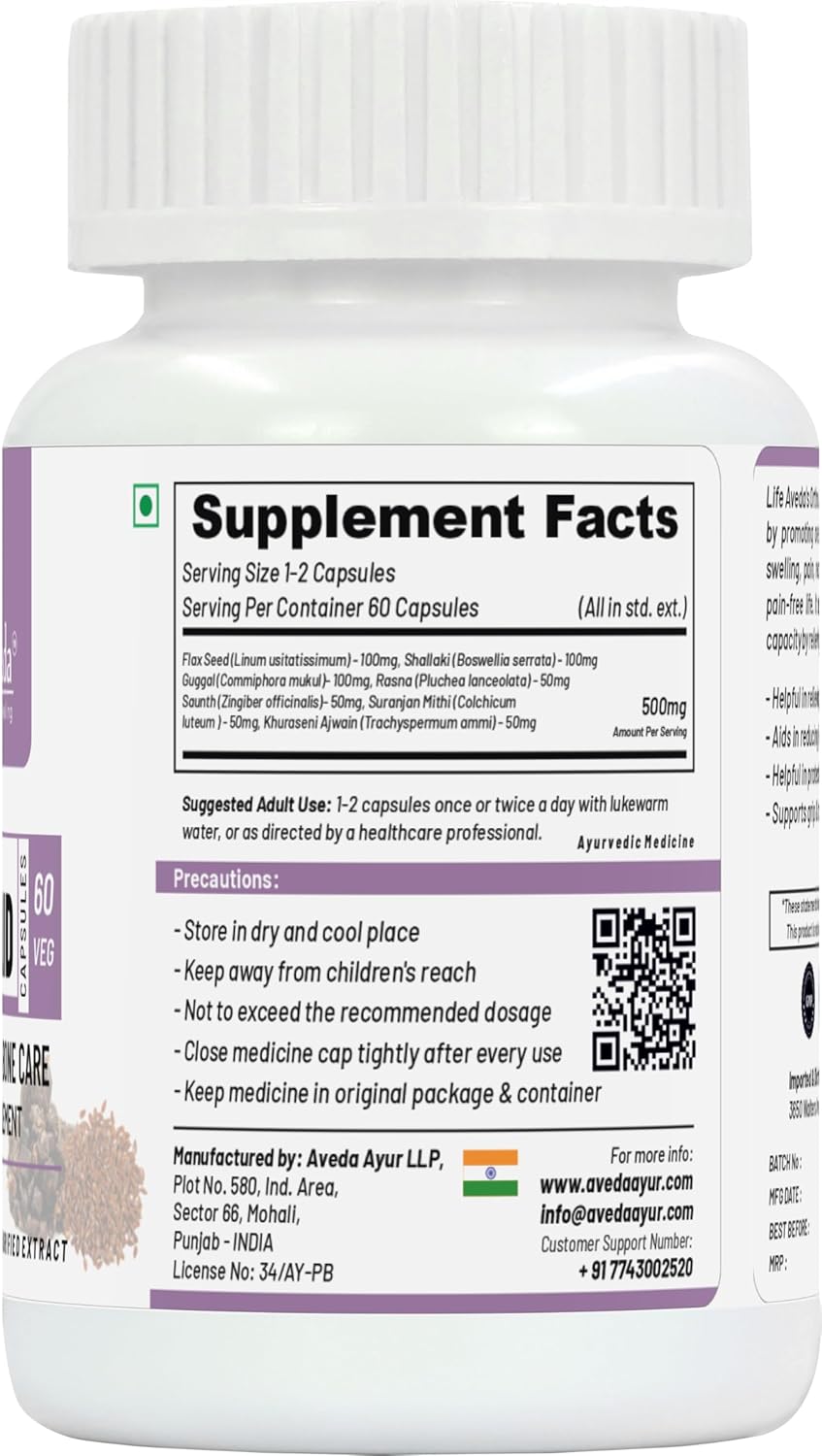 Life Aveda`s Premium Ortho Aid capsules contain standardized extracts of Flax Seed, Shallaki, Guggal, Rasna, Saunth, Suranjan Mithi, Khuraseni Ajwain and are packed in their pure, unaltered, 100% vegetarian, natural form and are free from gluten, flavors, sugars, and preservatives. The formulation is helpful to promote healthy bones and joints, relieve joint pain and inflammation. It also helps to improve muscle flexibility, reduce stiffness and spasm.