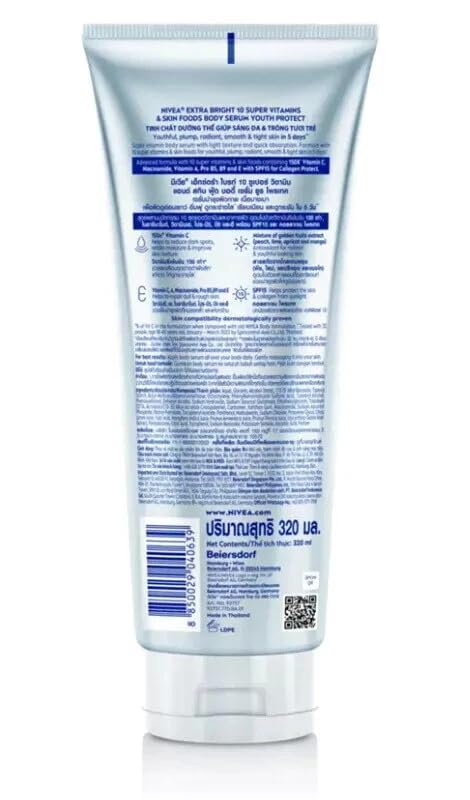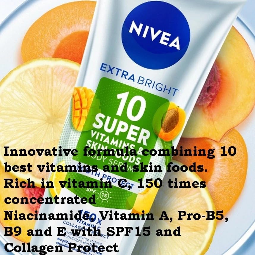 NIVEA Extra Bright 10 Super Vitamins & Skin Foods Body Serum is a powerful skin-brightening solution enriched with a blend of 10 super vitamins and nourishing skin foods. Designed to deeply nourish and protect, this lightweight body serum helps restore youthful, radiant skin while providing SPF15 protection against harmful UV rays. Infused with 150x Vitamin C and Collagen Protect, it improves skin texture, evens out tone, and visibly reduces dullness with consistent use. Its fast-absorbing formula keeps your skin smooth, healthy-looking, and glowing all day.