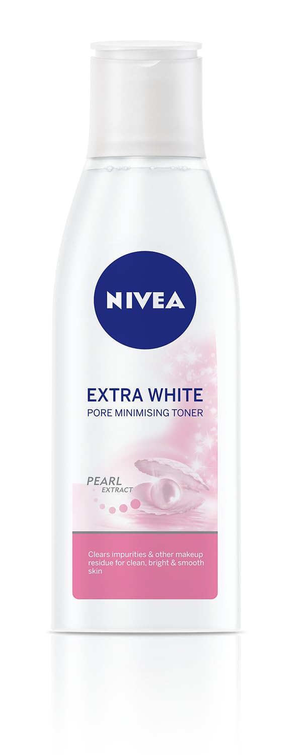 NIVEA Extra Bright Pore Minimising Toner 5-in-1 (200ml) Reveal a brighter, smoother complexion with NIVEA Extra Bright Pore Minimising Toner. Specially designed for dull and uneven skin, this 5-in-1 formula tones deeply while helping minimize the appearance of pores. Infused with licorice and pearl extract, it gently removes residual impurities, enhances skin clarity, and promotes a radiant, even-toned look.
