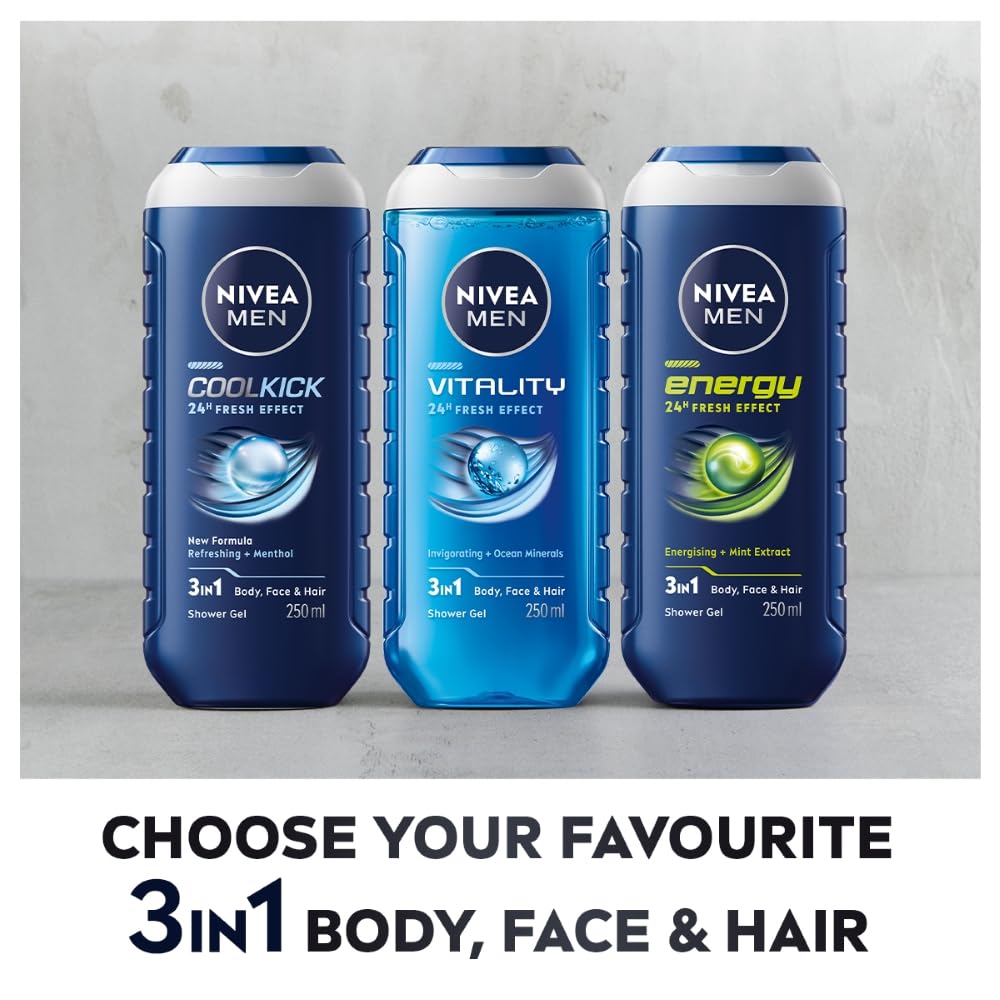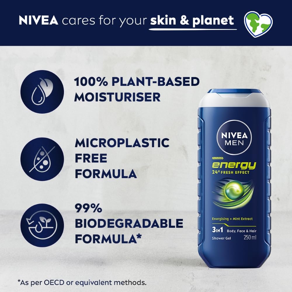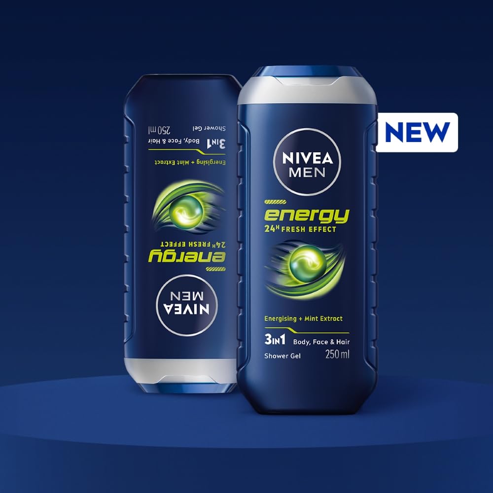 Formulated with mint extracts and infused with a masculine fragrance, NIVEA MEN Energy Shower Gel provides your skin and with a 24hour refreshing feeling, leaving it revitalized and cared for.
