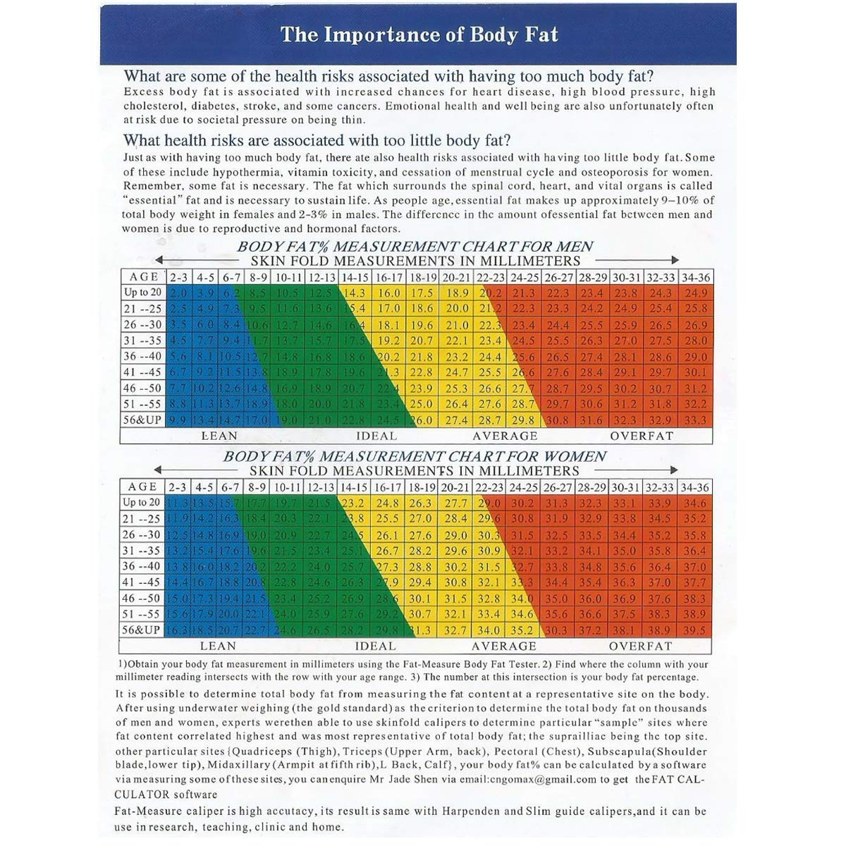 This Body Fat Caliper is useful to measure your body fat based on underlying fat.It bids farewell to traditional and complex methods of measuring body fat. So how do you measure your body fat percentage with the skinfold method? 1.A fat measurement tool to make a quick body fat measurement by yourself. 2.Fast Results: Get quick and accurate results in just 3 quick steps. Pinch. Click. Read 3.Perfect for fitness enthusiasts and personal trainers or weight loss purpose. 4.Once getting familiar with using the body fat caliper, you can get your measurements in a matter of seconds. Just match the results of the caliper with the chart, based on your gender and age. How to Use Pinch: While standing, with your fingers 2-3 inches apart, firmly grasp the suprailliac skinfold (the area above your hips) .between the thumb and index finger of your left hand. Gently pull the skinfold away from your body. Pull the skin and underlying at away from the muscle tissue. Click: With the White Coat Caliper Tool in your right hand, place the jaws over your skinfold about ¼” from your left thumb and index finger. The caliper tool should be halfway between the base and crest of the fold. It should be perpendicular to the fold. Now with your thumb press the Caliper Tool until the piece that says press into the dent on the caliper tool. Release the jaws of the caliper tool and record your measurement to the nearest millimeter, based on where the slider is at. Read: Check the chart, based on your gender to determine your body fat percentage at the intersection of your age and millimeter reading.