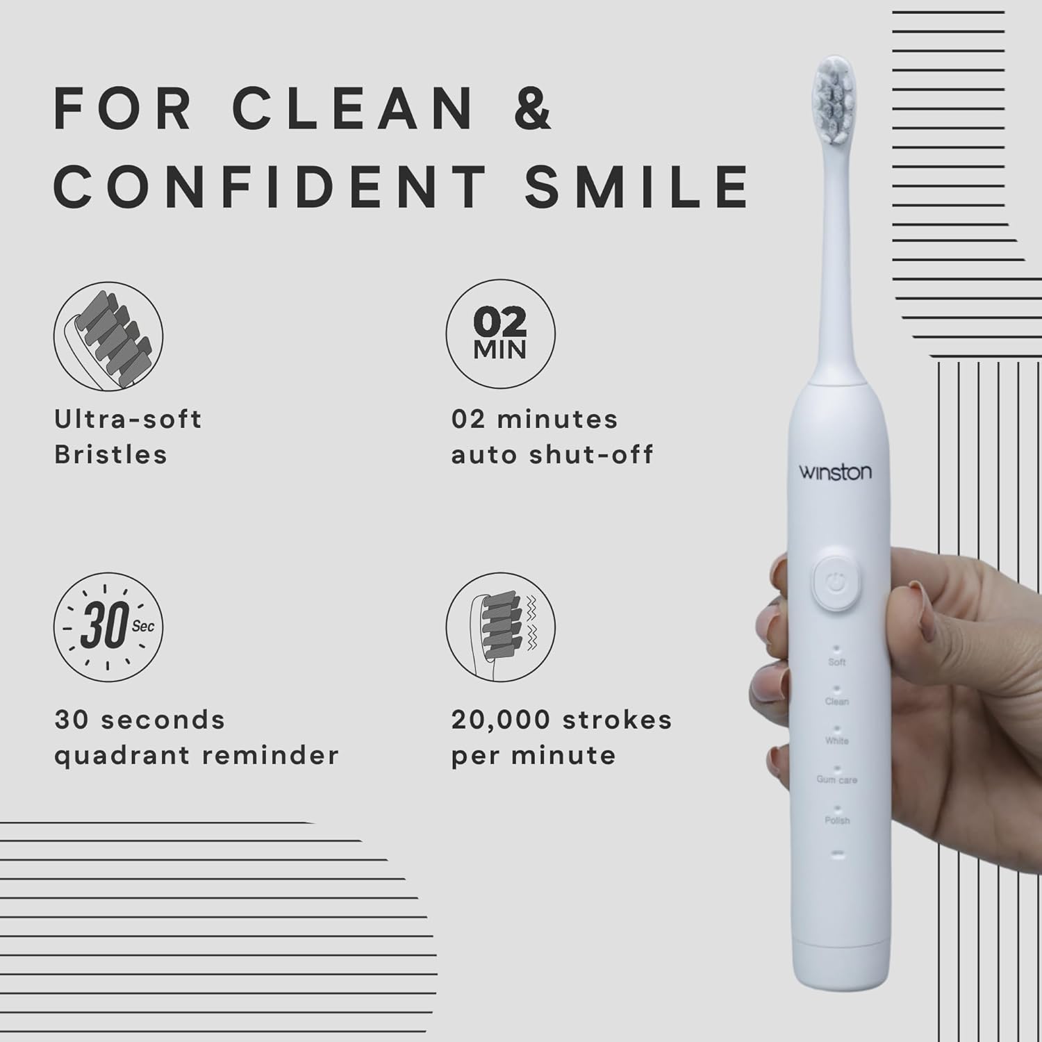 2 Minutes Smart Timer: Equipped with a built-in timer that ensures you brush for the dentist-recommended two minutes, evenly dividing the time between each quadrant of your mouth.