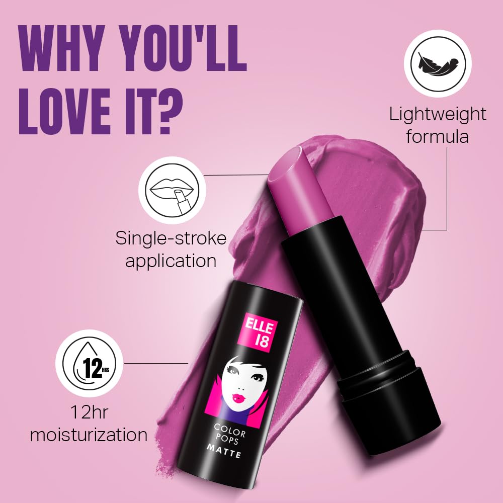The brand for every teenage girl who wants to have fun and look good at the same time is here. The Brand New Range of Matte Lipsticks from the Elle 18 range is here. Matte is in trend and we have the range to keep you trending. Apply a bold stroke of Elle 18 Color Pops Matte Lip Color to get the perfect look. Elle 18 Color Pops Matte Lip Color range of lipsticks gives high color payoff from a single stroke because of its new formulation. It last long because of the bold Matte texture. It has 30 vibrant and fun shades to choose from for your every mood and every look. So go through the wide range of Elle 18 Color Pops Matte Lip Color and pick the color of your pout! Buy Now! Some of the key features include: High performance lip color that gives you soft, smooth lips all day, and softens your, Smooth matte texture with a color fix formula, Available in 30 shades to choose from, It has long lasting color. How to apply: Start from centre of the upper lip and glide the lipstick along the contours of your mouth. Repeat the same for the lower lip.
