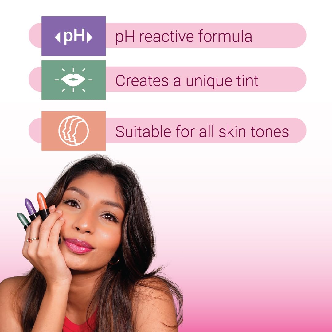 Key Benefits: Colour Change | Long lasting | Non-drying | Texture: Crayon | Finish: Glossy Shine | PH Reactive Formula Creates a Personalised Tint on the Lips that is Flattering for All Skin Tones.