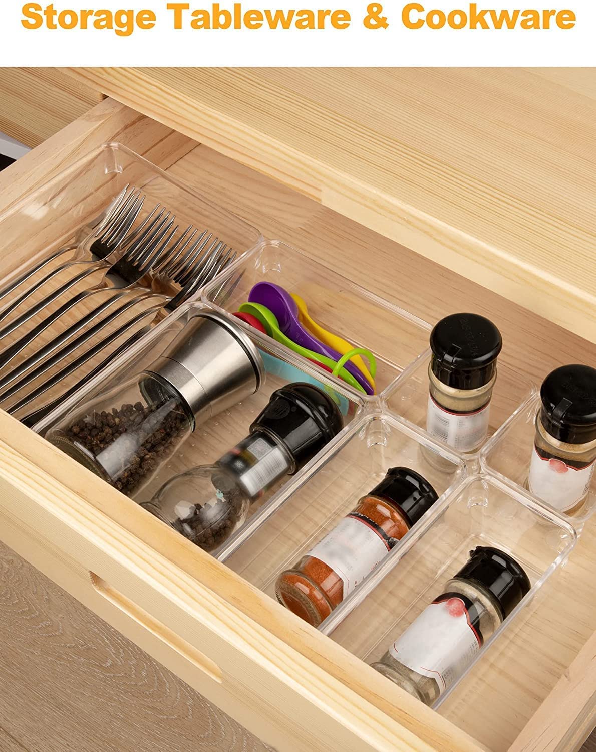 Kitchen Drawer Organizer: This organiser storage box for cosmetics can be a perfect fit for your kitchen drawer. Its acrylic organizer design allows for easy visibility of items. Its drawer divider feature allows for segregation of items, making it the ideal kitchen drawer organizer tray.