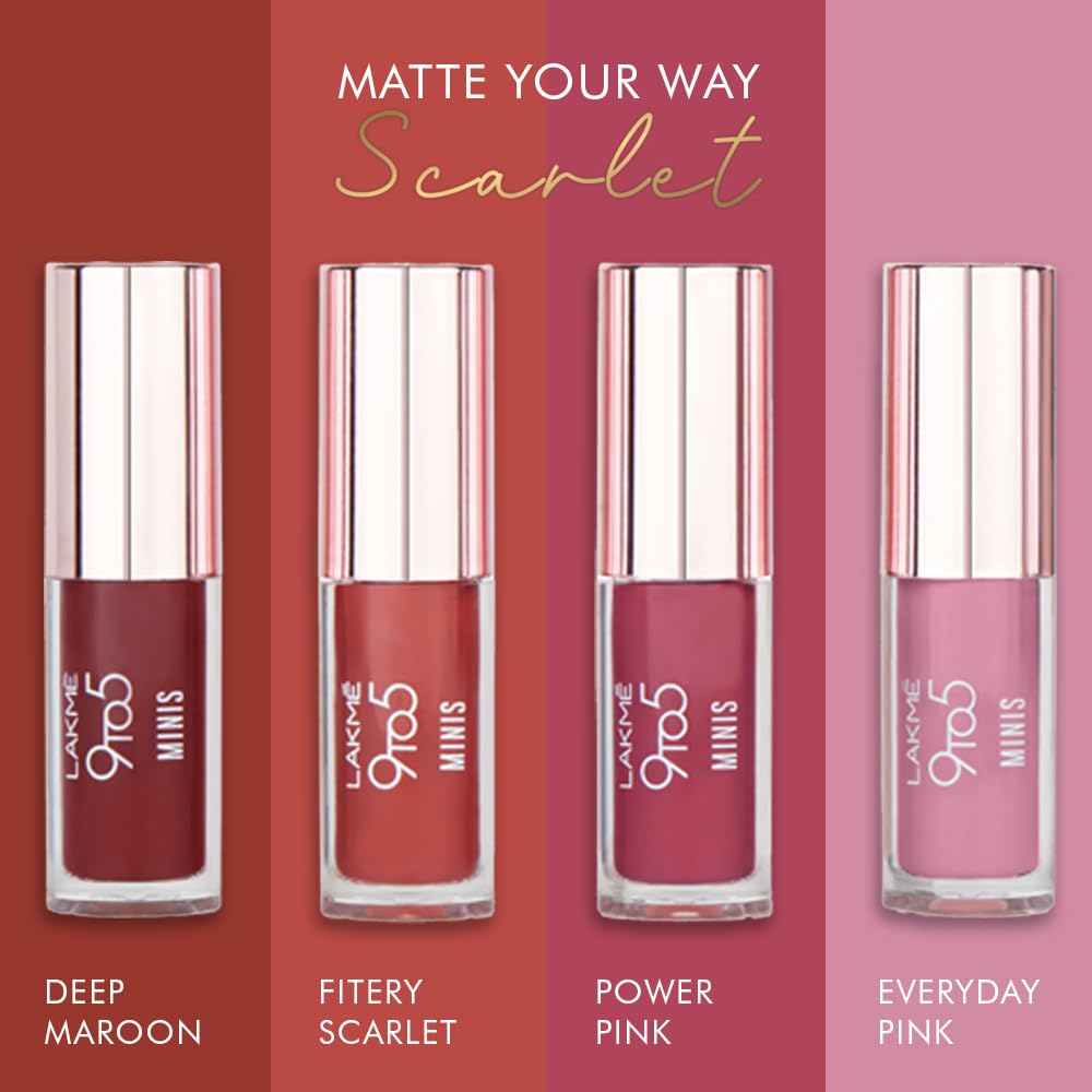 New Lakme 9to5 Primer + Matte Liquid Lip Color now in Minis. Pick your mood with Bold Collection or Nude collection The revolutionary formula with a built-in primer smoothens your lips to give you a crease-less finish now in Minis for you to carry a range in your bag.Got a hectic day at work or an impromptu after-hours plan? Go Bold with pinks & reds or Try the nude for the no make-up make-up look. It is transfer-proof, smudge-proof and waterproof and will last all day long. The intense matte color glides on easily and stays effortlessly smooth and matte, no matter what! The in-built primer will leave your lips unruffled and smooth, through it all Infused with Vitamin E and Argan oil, you will love how the luxurious lip color moisturizes and nourishes your lips, so they always feel soft, supple, and hydrated. What’s more, the Lakmé 9to5 Primer + Matte Liquid Lip Color is non-sticky, comfortable and doesn’t weigh down your lips. It has a one-stroke intense matte color payoff that lasts long. And its creamy application gives you a smooth finish unlike any other liquid matte color. Edgy, bold, glam, playful or natural, there’s something for every mood.