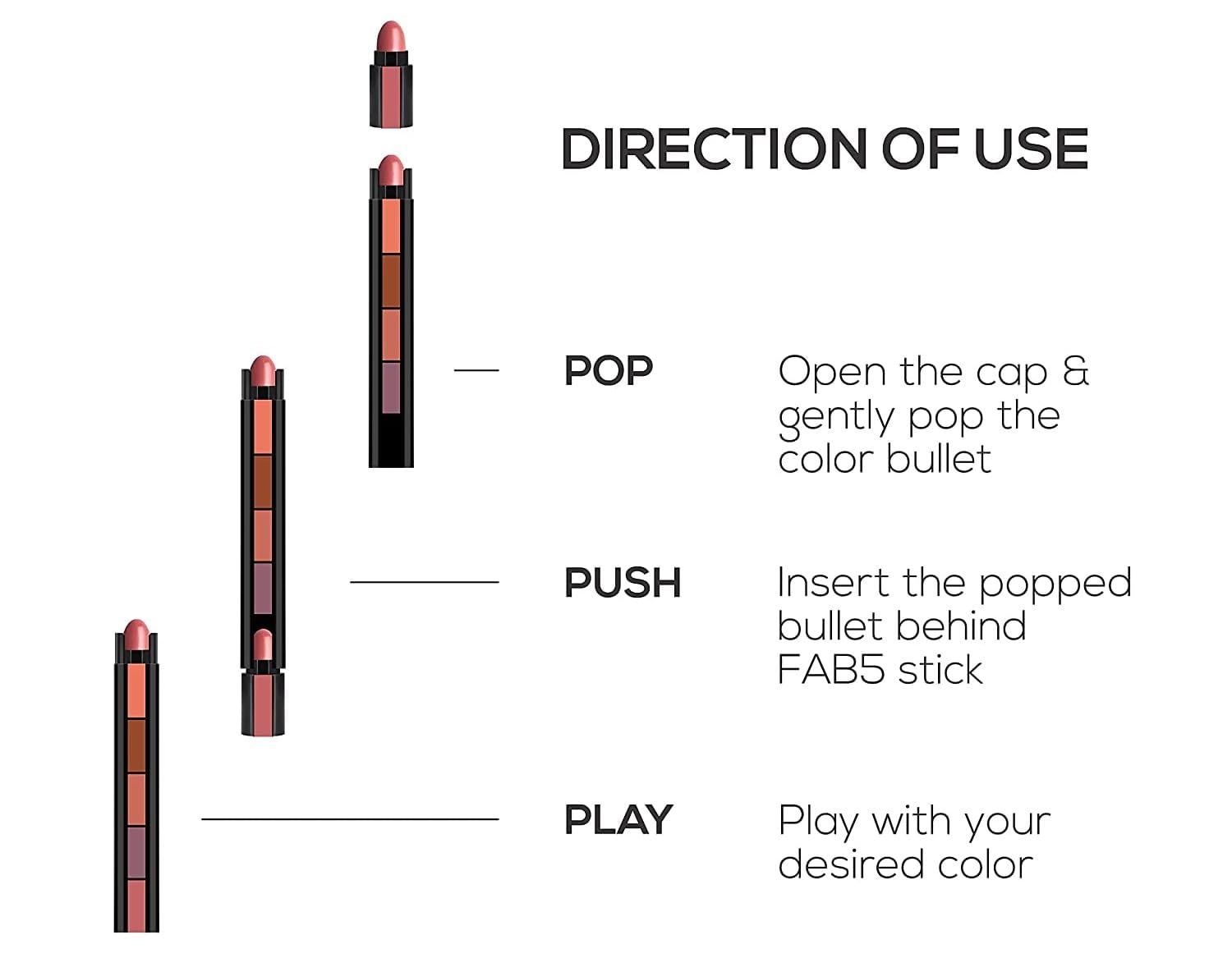 Easy to use & travel-friendly packaging. Fab 5 IN 1 Lipstick is a one-of-a-kind lipstick that comes in a unique 5 in 1 packaging which makes it absolutely convenient to carry and use. So, move over the fuss of stuffing your bag with makeup instead, just carry Fab 5 in 1 and rock different shades every day.