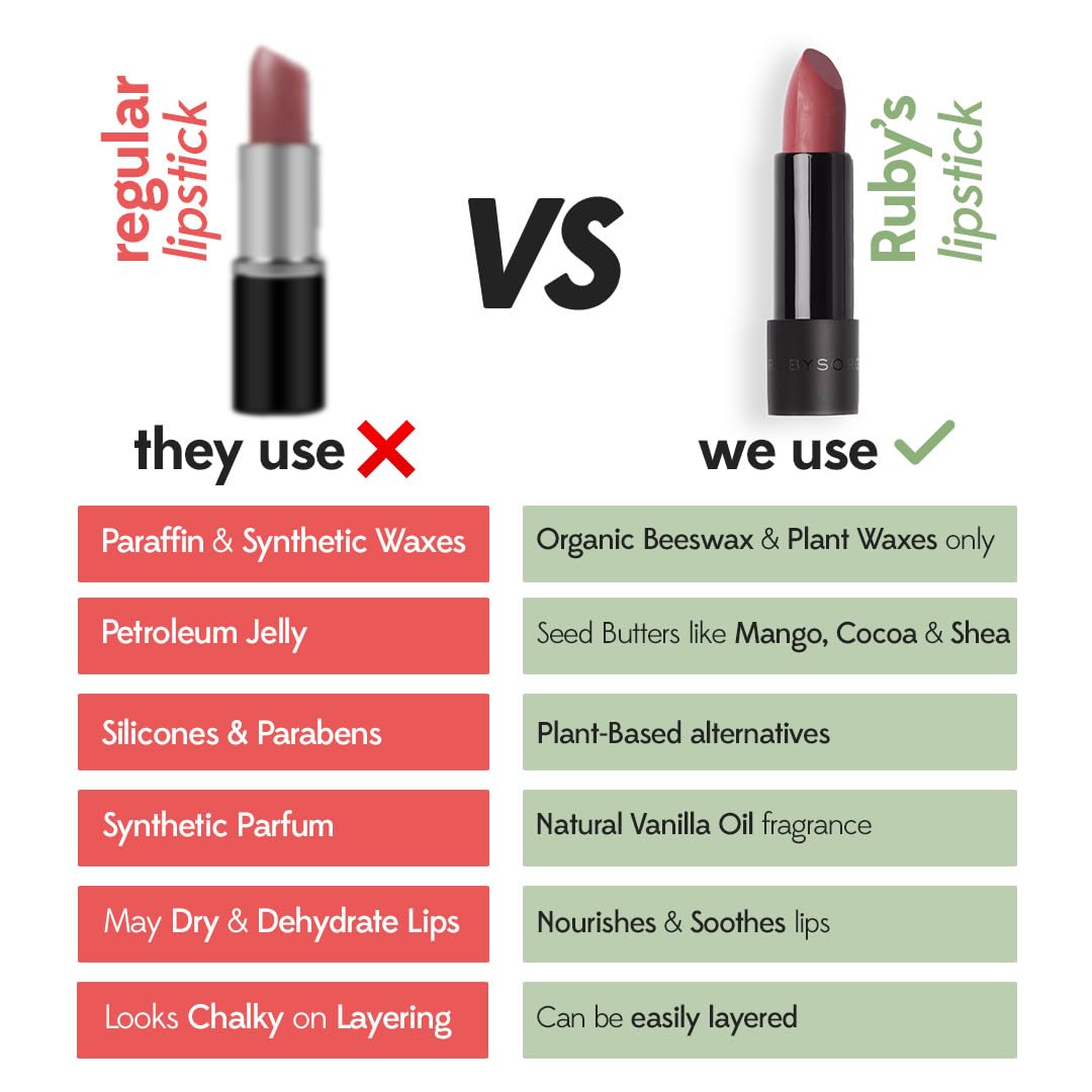 𝐒𝐞𝐦𝐢-𝐌𝐚𝐭𝐭𝐞 𝐋𝐢𝐩𝐬𝐭𝐢𝐜𝐤: Ruby’s Organics Semi-Matte Lipstick is formulated for all Indian skin tones, offering highly pigmented, moisturizing, and long-lasting wear. It’s lightweight and synthetic chemical-free, providing a guilt-free makeup experience.