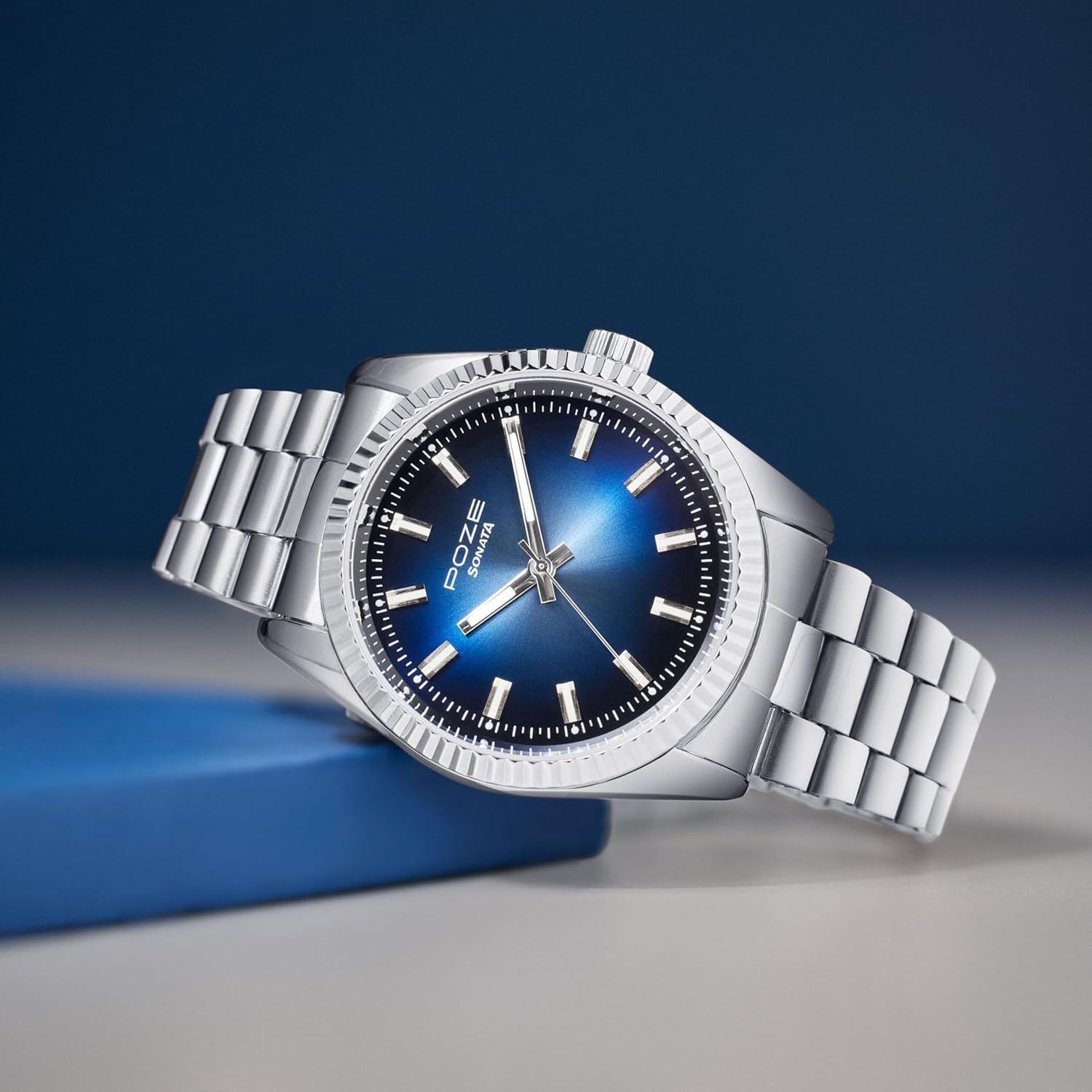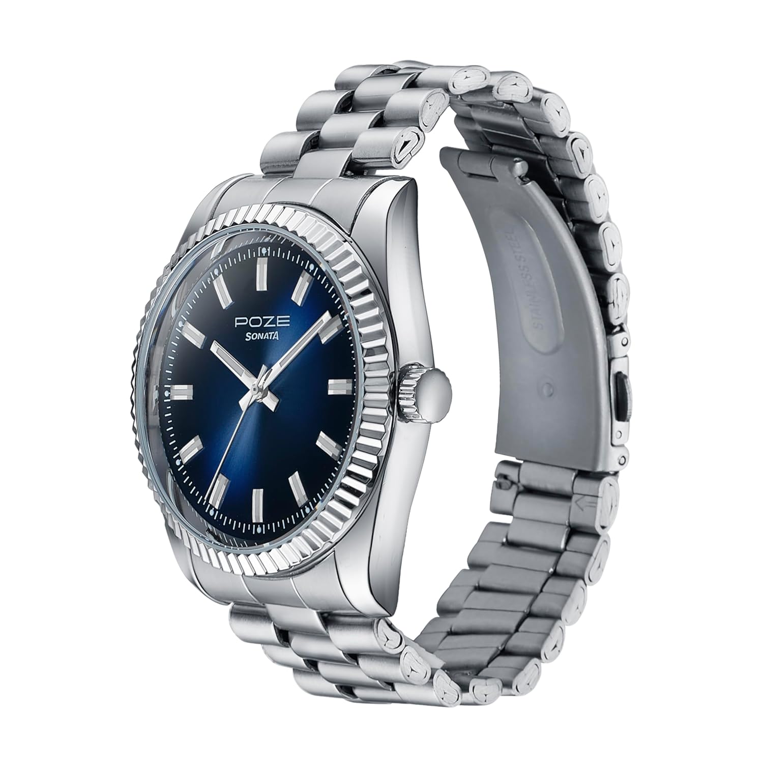 Sonata Poze Quartz Blue Dial Silver Metal Strap for Men