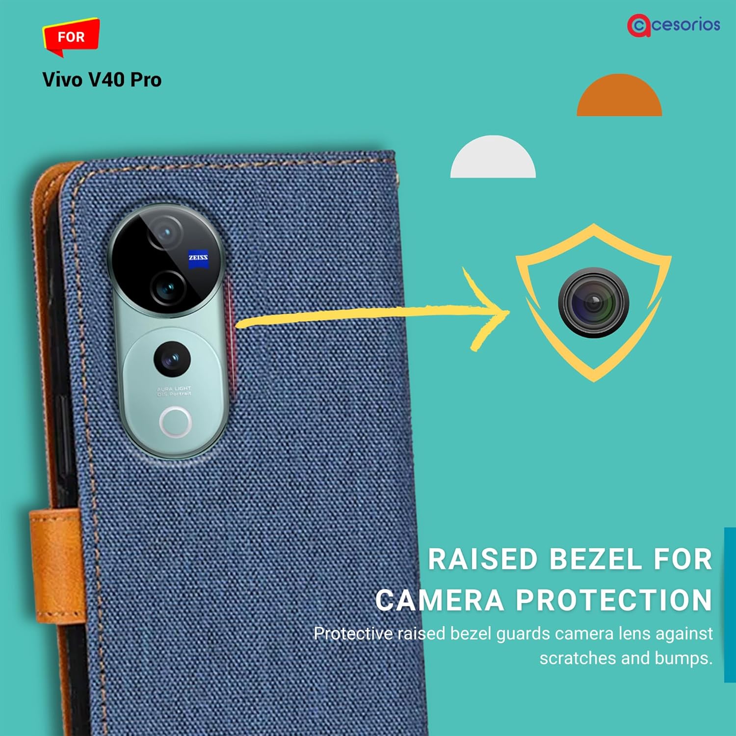 Stylish & Durable: Elevate your Vivo V40 Pro with our slim profile phone cover, crafted from faux leather and denim cloth, boasting a two-tone design and precise cutouts for easy access to ports and buttons.