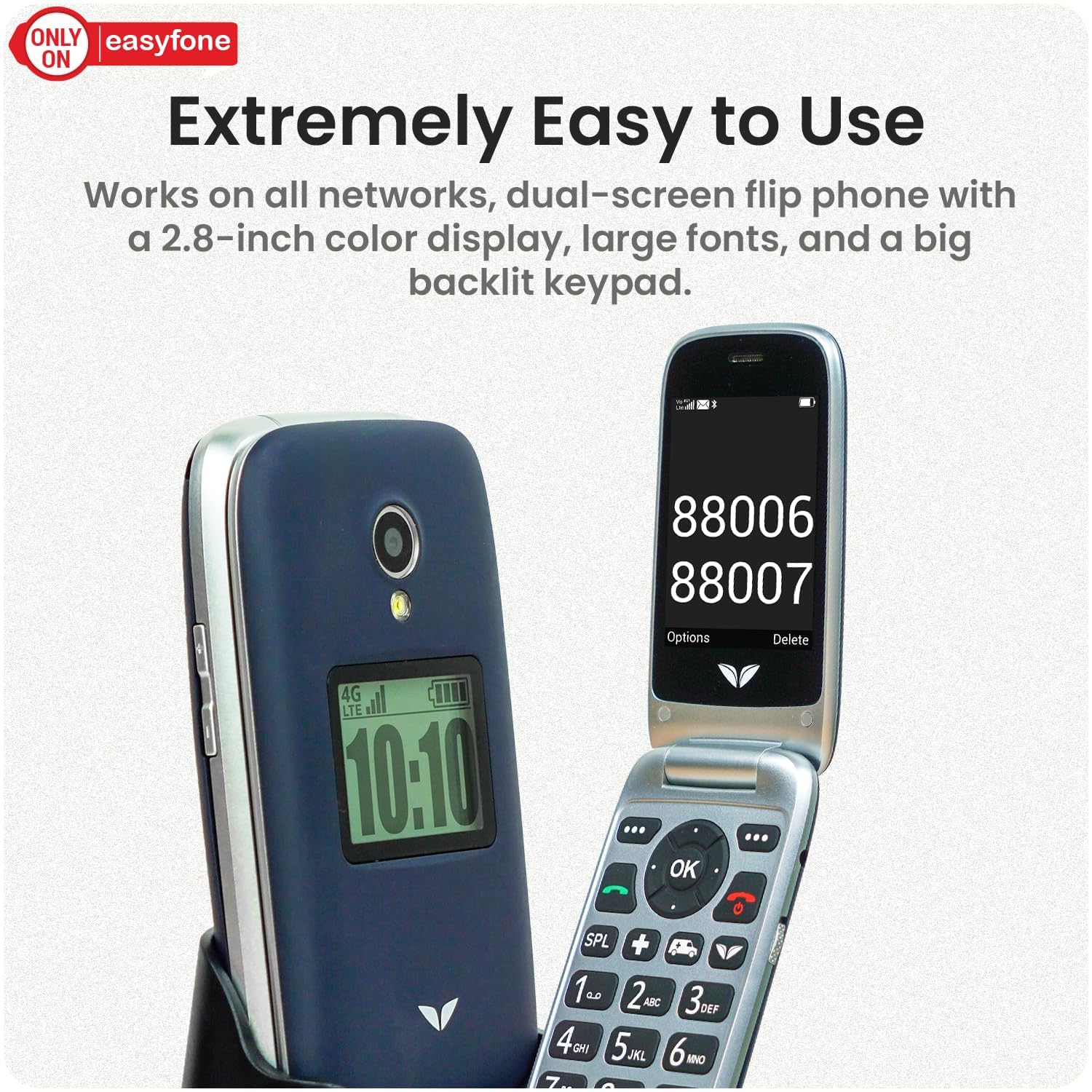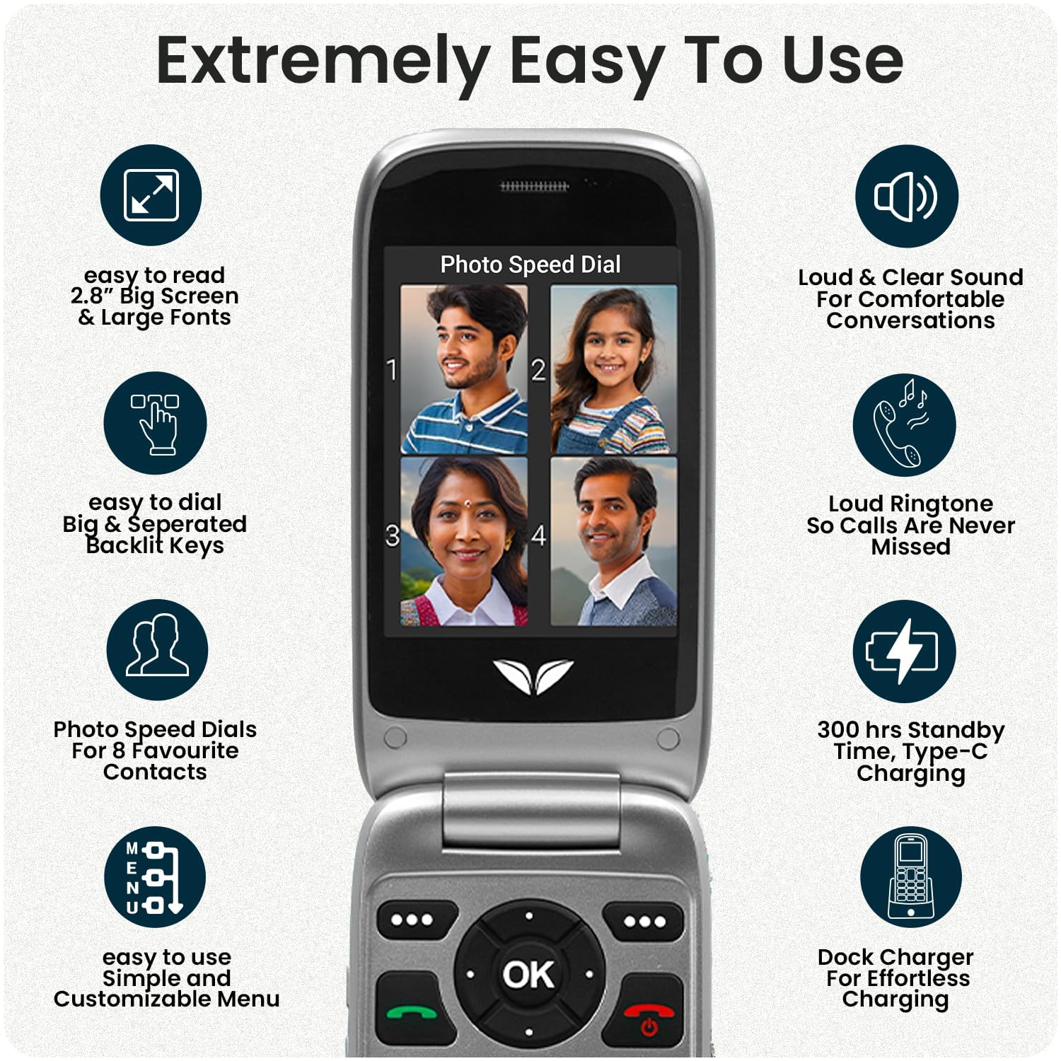 Dial with confidence and ease – 2.8 inch Flip phone, large seperated keys with talking and Backlit keypad, photo based speed dial for favorite contacts.