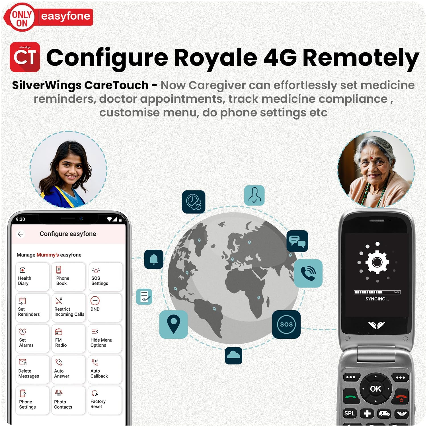 The Royale 4G lets an authorised family member configure the Royale 4G remotely from any part of the world with the SilverWings CareTouch App. With CareTouch, family members can configure contacts, and SOS settings, set medicine reminders, customise the menu, delete messages, use the advanced safety settings and a lot more. So you are always there to help no matter how far you are.