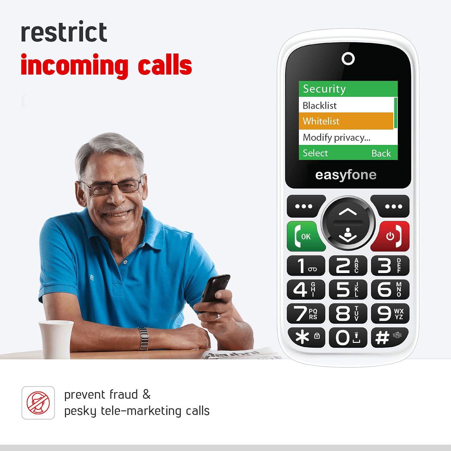 Worried about your elderly parents getting fraud calls or unnecessary telemarketing calls? The easyfone Udaan lets you specify a whitelist (up to 50 people) which then blocks incoming calls from all numbers other than the whitelisted numbers. Or you can blacklist a number to prevent that number from calling the easyfone.