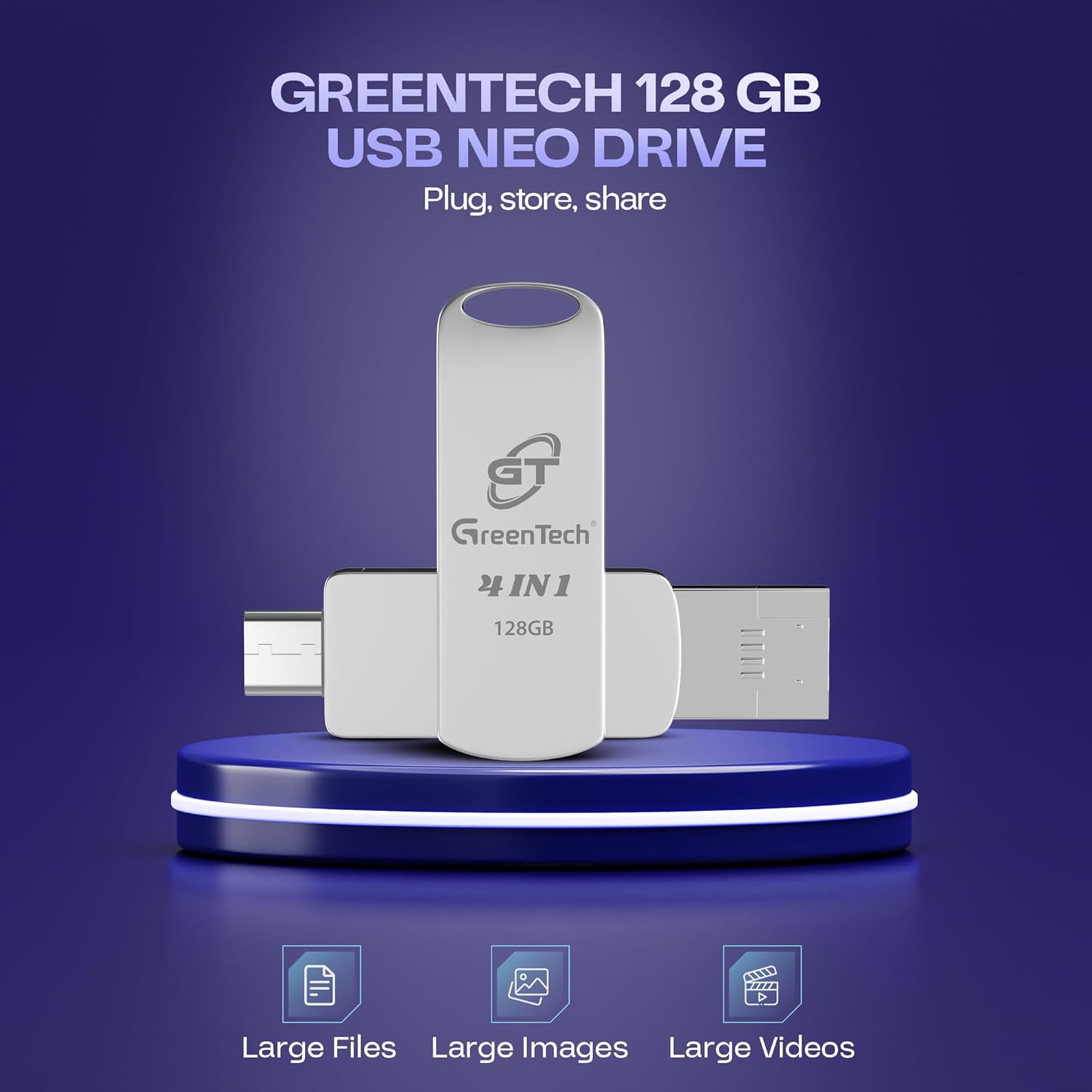 The GT GreenTech OTG USB 128 GB Neo Drive offers high-capacity portable storage, letting you store, access, and manage your files with ease, no matter where your busy lifestyle takes you.