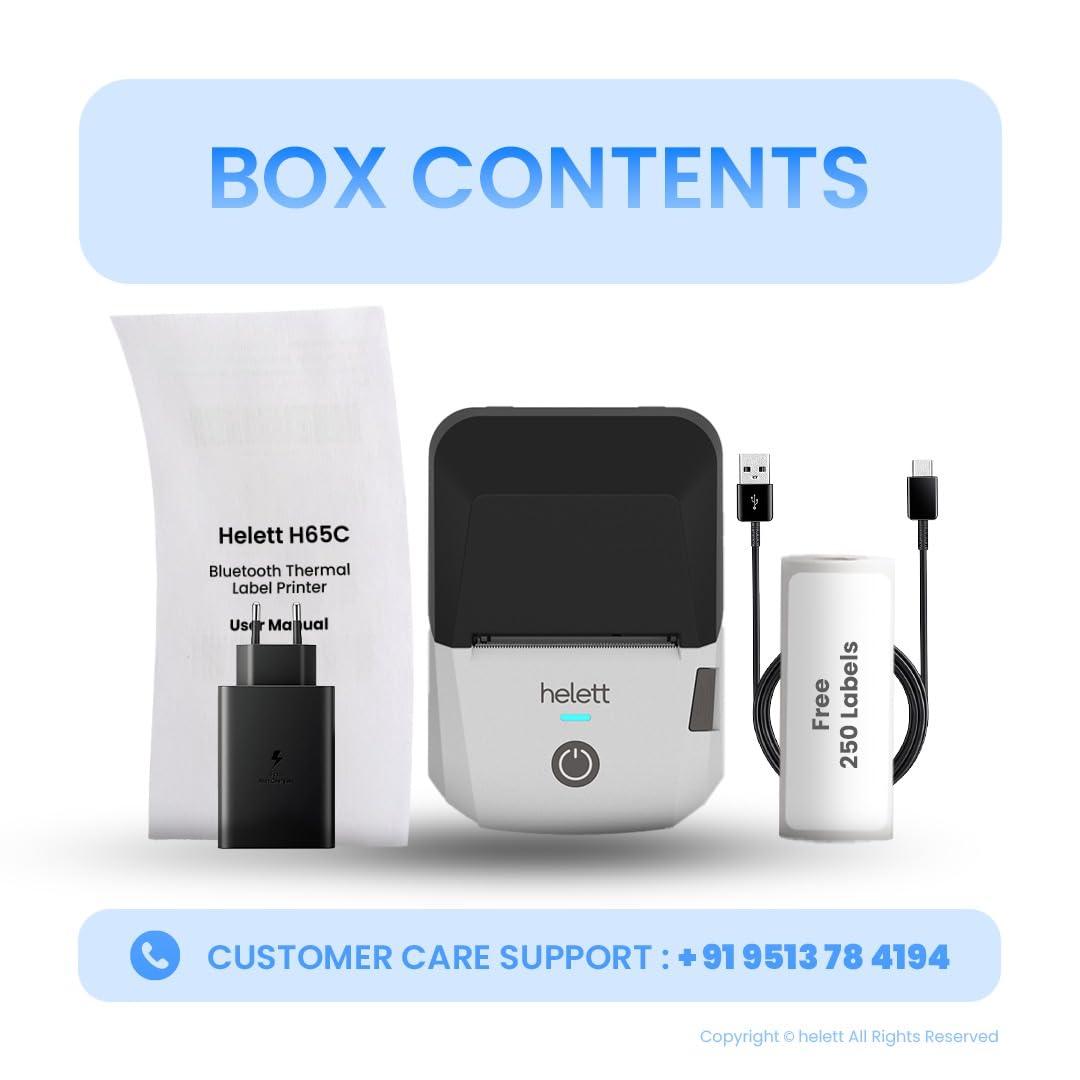 Exceptional Customer Support: Access prompt assistance for any installation or troubleshooting needs with the Helett H65C Portable Bluetooth Thermal Label Printer. Customer care number provided on the product ensures quick resolution of queries or issues, offering peace of mind and ensuring a smooth user experience from setup to ongoing use.