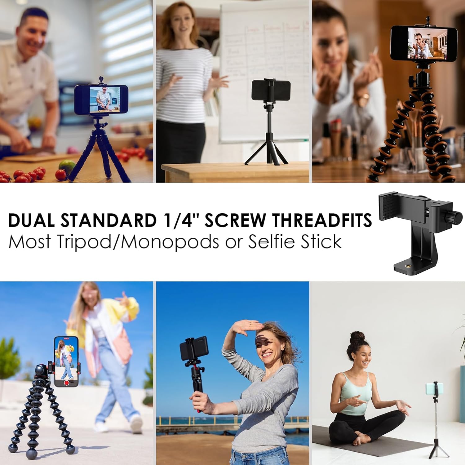 KEKOZE 360° Degree Adjustable Cell Phone Holder for Tripod The KEKOZE 360° Degree Adjustable Cell Phone Holder is the perfect companion for your tripod, offering superior versatility and support for your smartphone. Whether you’re vlogging, capturing photos, or recording videos, this holder ensures your phone is securely mounted, providing steady and clear shots every time. Key Features: 360° Rotatable Design: Adjust your phone to any angle with a full 360° rotation for the perfect shot, whether you’re shooting horizontally or vertically. Universal Compatibility: This phone holder is compatible with all smartphones, including iPhones, Android devices, and more. It fits perfectly with all types of tripods, making it a must-have accessory for photographers and content creators. Adjustable Clamp: The adjustable clamp ensures a secure fit for phones of all sizes. No more worrying about your phone slipping out of place while recording or streaming. Durable & Stable: Crafted with high-quality materials, the KEKOZE phone holder is designed for long-lasting durability and stability, even during extended use. It offers a firm grip to keep your phone safe and steady. Ideal for Vlogging & Photography: Whether you’re recording videos, streaming live, or taking photos, this phone holder helps you achieve smooth and professional-quality content every time. Compact & Portable: Its lightweight and compact design make it easy to carry around, making it ideal for on-the-go content creators and photographers. Perfect for: Vlogging Photography Video Recording Live Streaming Video Calls Social Media Content Creation Enhance your video recording and photography experience with the KEKOZE 360° Degree Adjustable Cell Phone Holder for Tripod. Get yours today and enjoy steady shots, seamless streaming, and more!