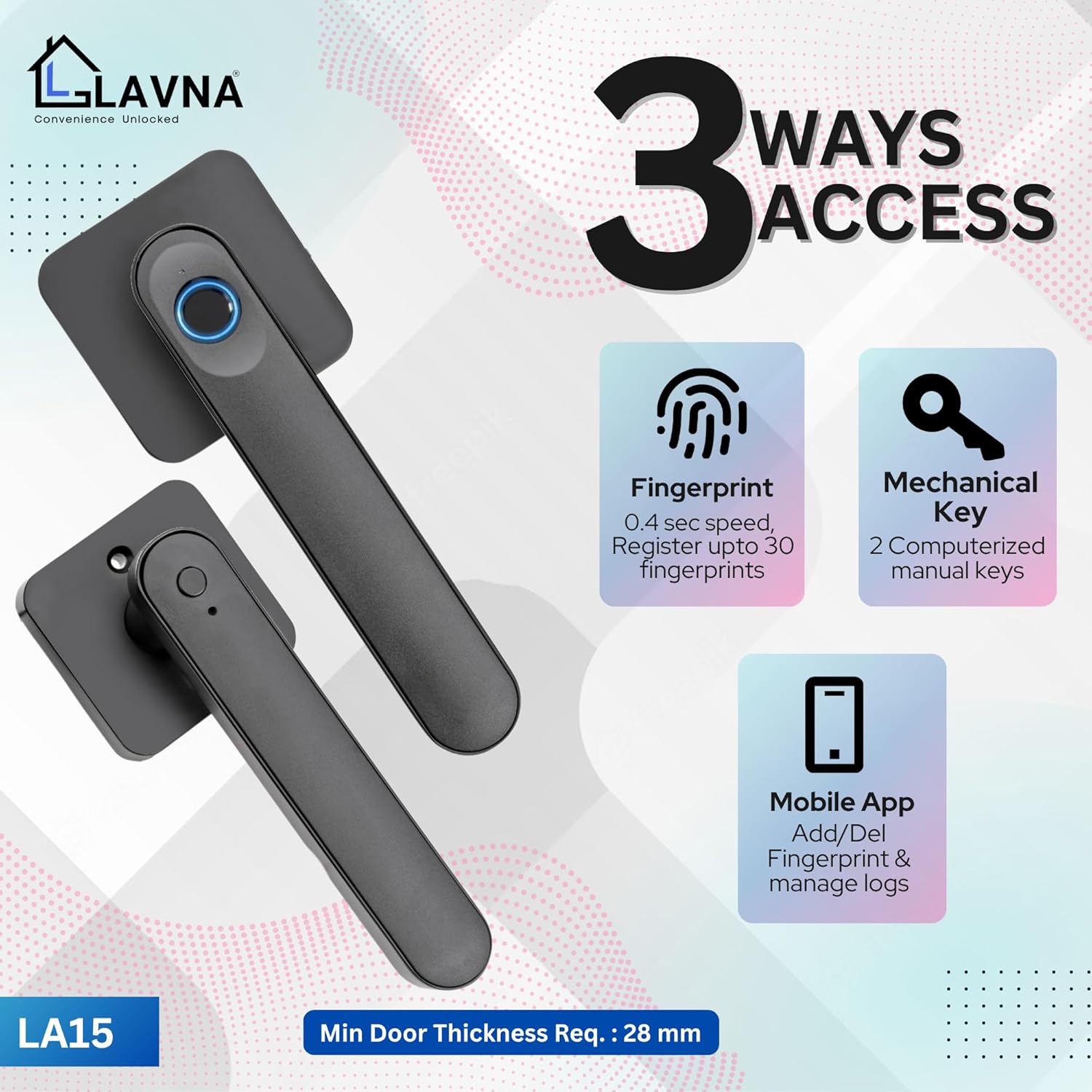 Bluetooth Mobile APP. – This lock completely operate through LAVNA SmartLife mobile application. You can Add or Delete any fingerprint via mobile app. || Bluetooth Unlocking : you can also unlock the door from your LAVNA Smart Life mobile app with in the bluetooth range.