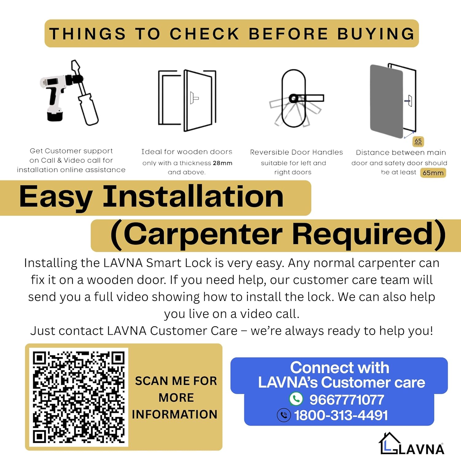 DIY Installation : This lock is very easy to install, any normal carpenter can install the lock with the help of our installation video also our customer care team will support online thru Calls and Video calls
