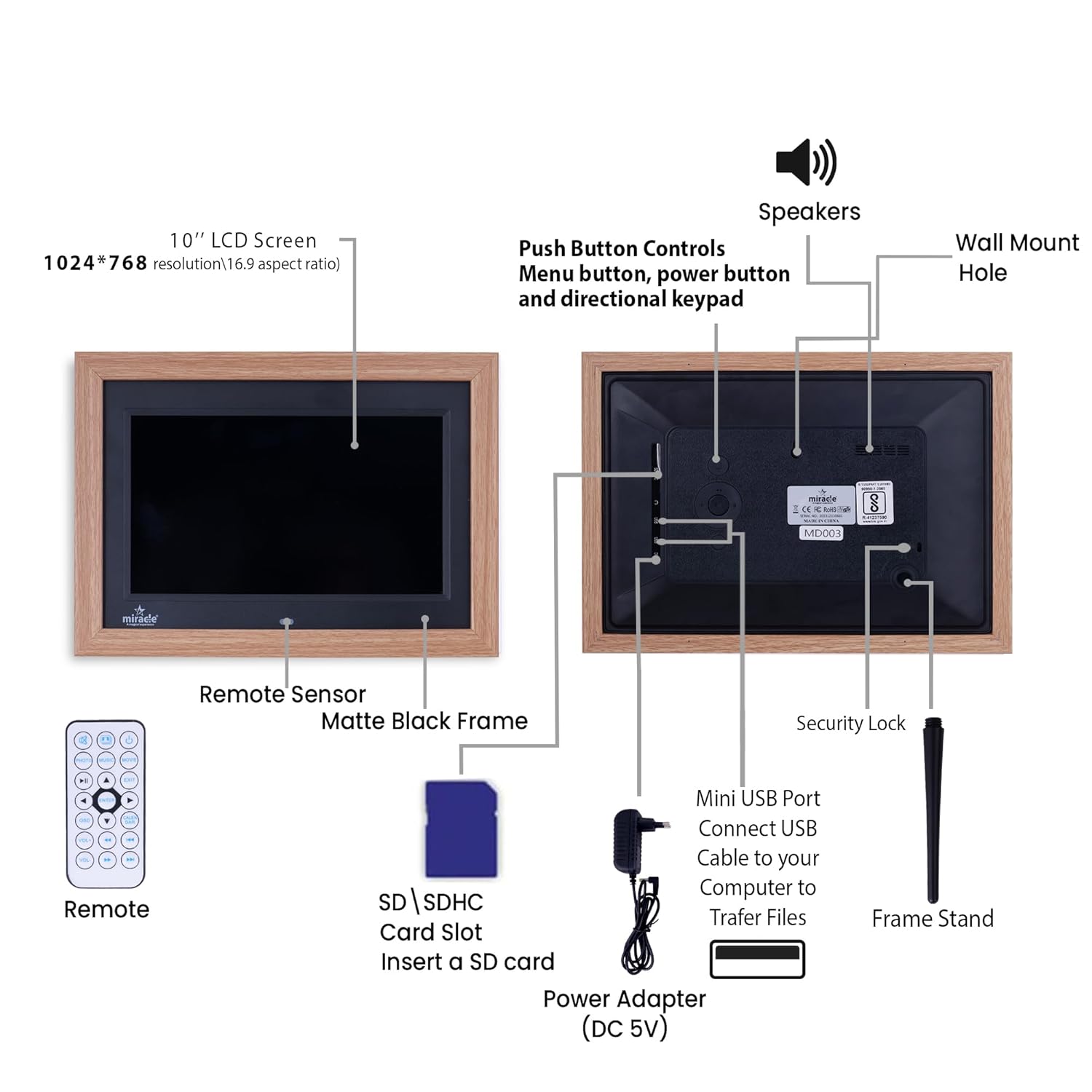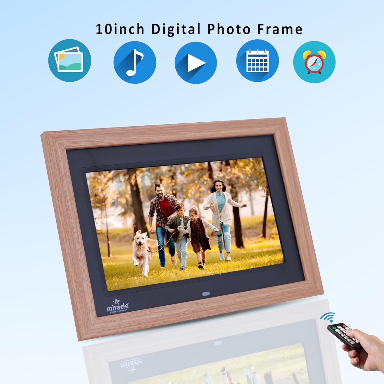 Miracle Digital 10inch(25.4cm) IPS Wooden Photo Frame Built in 8GB Memory & 2gb Ram High Def Screen,USB,SDCard Remote Control Support Photo SlideShow,Video,Audio,180°Wide Angle Viewing (Natural Wood)