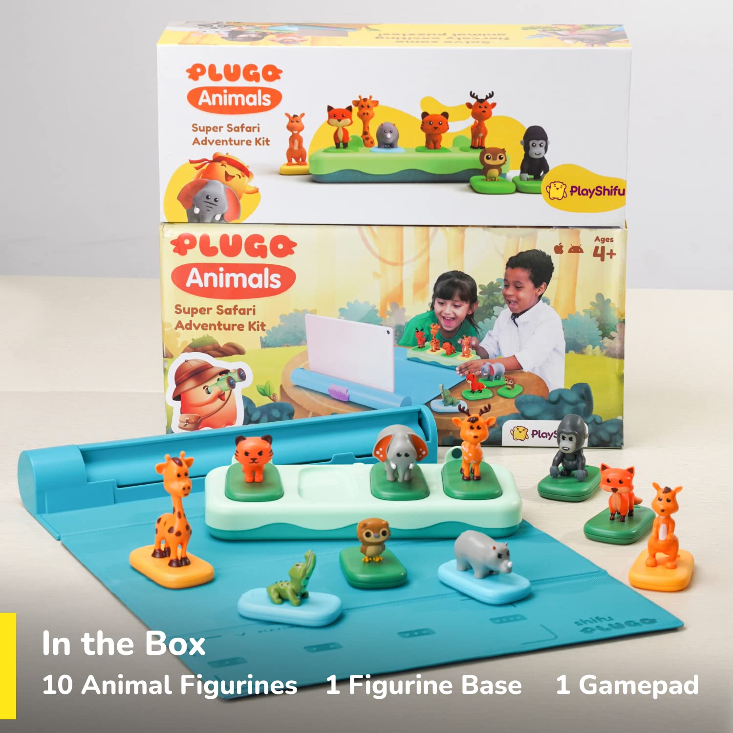 IN THE BOX – 10 Animal Figurines (alligator, elephant, fox, tiger, gorilla, giraffe, deer, owl, kangaroo, rhinoceros), 1 Figurine Base, 1 Gamepad