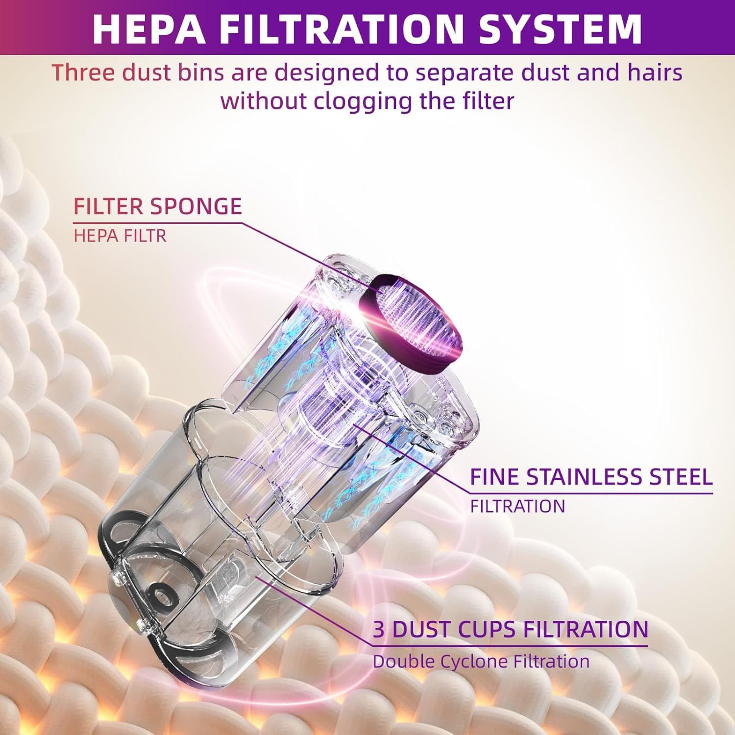 Its specialized design includes cyclonic technology for deep dust extraction, UV light sterilization to eliminate bacteria and mites, and a HEPA filter that captures 99.99% of dust and allergens — ensuring a truly hygienic sleeping and lounging