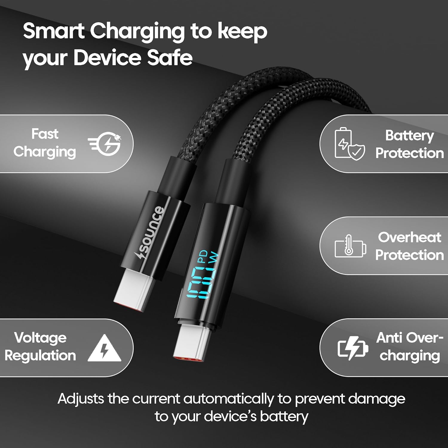 ✅【100W (5A) Fast Charging】: The Sounce 100W Type-C to Type-C PD cable delivers ultra-fast charging, supporting up to 100W (5A) power output. It ensures quick and efficient charging for all your Type-C devices when used with compatible chargers, offering optimal performance for smartphones, laptops, and more.