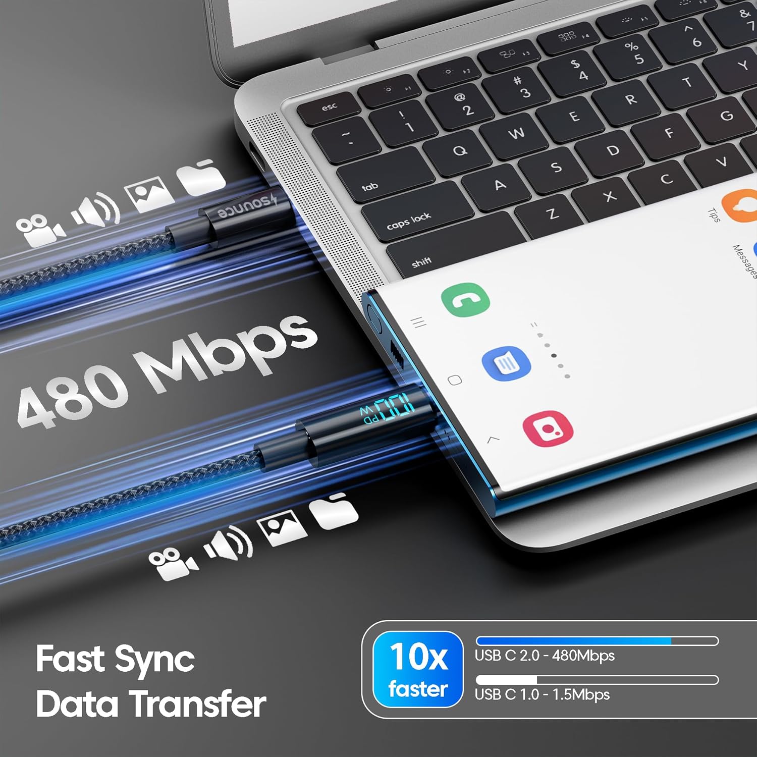 ✅【480 Mbps Speed】: The Sounce 100W cable supports data transfer at speeds up to 480 Mbps, allowing you to easily transfer files, photos, and videos between USB-C devices. With its 1.2-meter length, it’s portable and versatile, ideal for use at home, in the office, in your car, or while traveling.