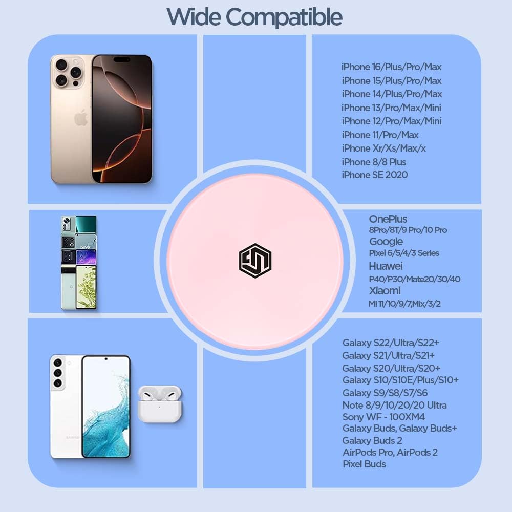 Input 5V/2A,9V/2A,12V/1.5A Output 5W/7.5W/10W/15W Multiple Protections Overvoltage, Overcurrent, Short Circuit, Overtemperature, etc. iPhone Compatibility iPhone 16, 16 Plus, 16 Pro, 16 Pro Max, iPhone 15, iPhone 15 Plus, iPhone 15 Pro, iPhone 15 Pro Max, iPhone 14, iPhone 14 Plus, iPhone 14 Pro, iPhone 14 Pro Max, iPhone 13, iPhone 13 Pro, iPhone 13 Pro Max, iPhone 13 Mini, iPhone 12, iPhone 12 Pro, iPhone 12 Pro Max, iPhone 12 Mini, 11/11 Pro/11 Pro Max, SE/X/XR/XS/XS Max/8/8 Plus Samsung Compatibility Samsung Galaxy S23 Galaxy Z Flip 3, Galaxy Z Flip Ultra S20/ S20 Plus/ S20 Ultra/ S10/ S10 Plus/ S10 E/ S9/ S9 Plus/ Note 20/ Note 10/ S8/ S8 Plus/ S7/ S7 Edge Others Google Pixel 6/6 pro/S/Sa/4/4xl/3/3xl/LG V60/V50/V40/V35/V30/G8/G8X/G7, AirPods/AirPods Pro/Galaxy Buds/Galaxy Buds+ and All Other Qi Enabled Devices
