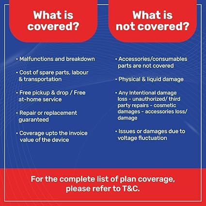What’s included and What’s excluded: All labor, spare parts, & transportation charges for repairing the mechanical defects & electric malfunctions of the device will be covered as per the extended warranty. The plan does not cover Accidental or Liquid damages, Damage caused by unauthorized repairs, Accessories, Consumables, or parts that are not covered under the standard Brand warranty.