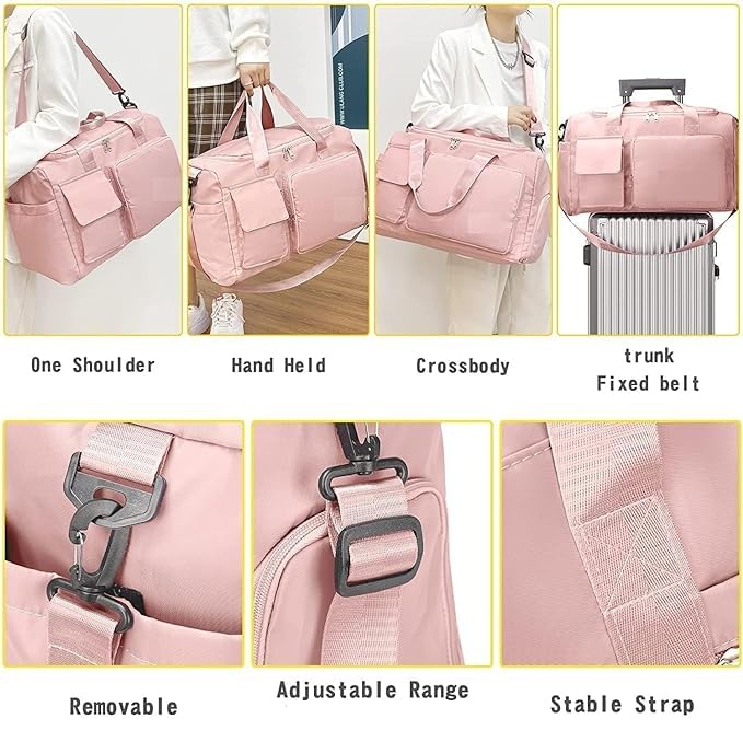Multi-Function Travel Duffel Bags Gym Bag for Men And Women Travel Bag with Wet Pocket & Shoe Compartment Weekender Overnight Bag. Travel bag can be carried by hand, single-shouldered, across the shoulder or fixed to a trolley case as you like. Detachable shoulder strap can be adjusted and locked to the length you need. The back fixing belt of the bag on the trolley case for fitness travel, which is easy and comfortable. Durable Water-Resistant Material this gym travel bag is made of Nylon fabric, it is water-resistant and durable. And it is easy to clean. Sturdy And Smooth Zippers The zipper is made of premium durable materials, it’s sturdy and smooth and it is easy to slide. Weekender Carry On Bag Moist separated compartment is specially designed for storing wet items or dirty clothes after exercise, such as socks, underwear, swimwear, towel or swimming goggles. Removable & Adjustable Shoulder Strap Our duffel bag has an adjustable shoulder strap. The buckle is easy to buckle up or take off. It can be used as travel bag, gym bag or weekender bag. Multifunctional Pockets Dry and wet separation, independent shoe compartment Large-capacity storage space, including multiple storage bags, travel items can be stored in them. 2 side pockets to ensure hassle free access to shoes, handkerchiefs, towels etc. and 2 additional front zipper pockets to keep electronic accessories and other frequently needed items while travelling